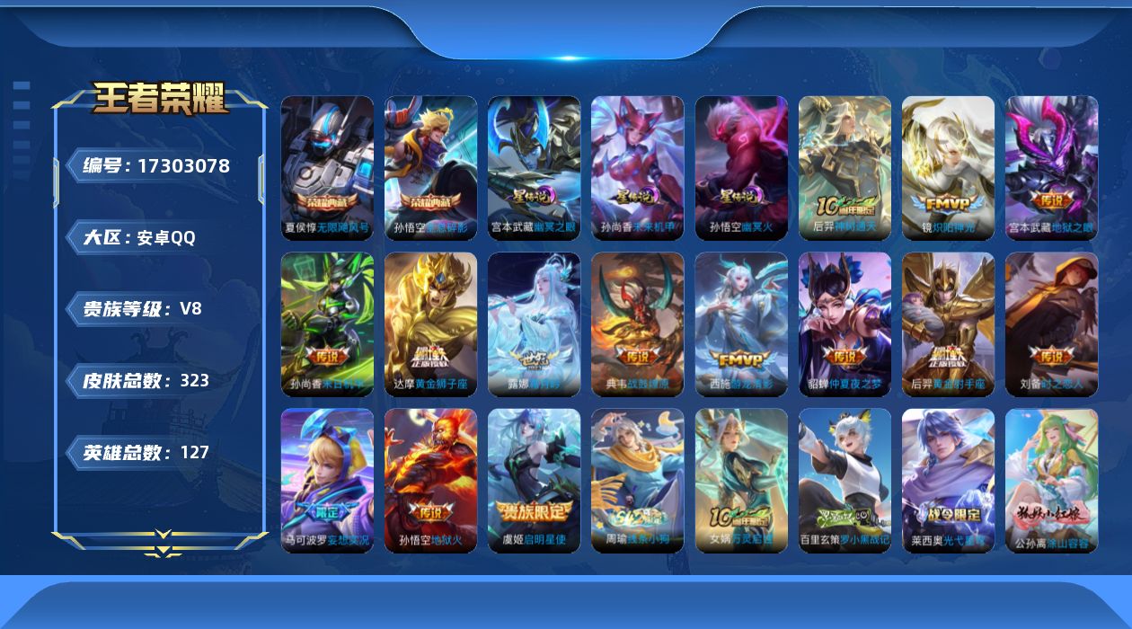 [17303078]【店主推荐捡漏号!可直接换绑】安卓Q-V8-至尊星耀III段位-127英雄-323皮肤-2典藏皮肤-14传说-85史诗-3星元 【英雄全皮】:鬼谷子全皮,影全皮 【荣耀典藏】:孙悟空全息碎影,夏侯惇无限飓风号 【传说皮肤】:后羿神树通天,典韦战鼓燎原,露娜霜月吟,马可波罗妄想实况,西施游龙清影,镜炽阳神光,虞姬启明星使,刘备时之恋人,达摩黄金狮子座,后羿黄金射手座,貂蝉仲夏夜之梦,孙尚香末日机甲,宫本武藏地狱之眼,孙悟空地狱火 【限定皮肤】:白起狰,姜子牙天穹之誓,李白谪仙醉月,狄仁杰阴阳师,虞姬凯尔特女王,赵云皇家上将,嬴政优雅恋人,嬴政白昼王子,鲁班七号狮舞东方,庄周蜃楼王,高渐离死亡摇滚,阿轲迷踪丽影,孙膑妖精王,扁鹊炼金王,芈月重明,吕布猎兽之王,元歌云间偶戏,元歌无心,夏侯惇朔风刀,曹操烛龙,典韦穷奇,典韦蓝屏警告,马可波罗暗影游猎,马可波罗妄想实况,狄仁杰魔术师,狄仁杰万华元夜,达摩沙漠行僧,项羽海滩派对,老夫子圣诞老人,老夫子醍醐杖,关羽冰锋战神,程咬金演武夺筹,刘邦夺宝奇兵,兰陵王金庭之子,花木兰青春决赛季,亚瑟狮心王,孙悟空至尊宝,牛魔御旌,李元芳银河之约,李元芳云中旅人,虞姬启明星使,钟馗神迹守卫,杨玉环遇见飞天,女娲朔望之晖,干将莫邪胡桃夹子,雅典娜单词大作战,雅典娜黎明之约,蔡文姬繁星吟游,太乙真人饕餮,鬼谷子原初探秘者,鬼谷子五谷丰年,百里玄策原初追逐者,弈星混沌棋,沈梦溪星空之诺,沈梦溪大漠名商,明世隐疑决卦,裴擒虎李小龙,裴擒虎擒涛扼浪,狂铁御狮,米莱狄御霄,云中君纤云弄巧,盾山御銮,猪八戒西部大镖客,上官婉儿梁祝,蒙犽狂想玩偶喵,鲁班大师探海日志,张良古海寻踪,鬼谷子天穹祈灯,沈梦溪龙舞盛年,刘邦剑破天穹,程咬金群星魔术团,刘备异域游侠,芈月浮光幕影 【赛季限定】:亚瑟狮心王,庄周蜃楼王,孙膑妖精王,扁鹊炼金王,虞姬凯尔特女王,白起狰,太乙真人饕餮,曹操烛龙,芈月重明,典韦穷奇,狂铁御狮,米莱狄御霄,牛魔御旌,盾山御銮,夏侯惇朔风刀,弈星混沌棋,明世隐疑决卦,老夫子醍醐杖,鬼谷子原初探秘者,狄仁杰万华元夜,程咬金演武夺筹,达摩沙漠行僧,兰陵王金庭之子,沈梦溪大漠名商,李元芳云中旅人,裴擒虎擒涛扼浪,鲁班大师探海日志,张良古海寻踪,鬼谷子天穹祈灯,刘邦剑破天穹,姜子牙天穹之誓,东皇太一噬灭天穹,太乙真人谧流熔炉,甄姬逆浪荇歌,亚瑟荣光