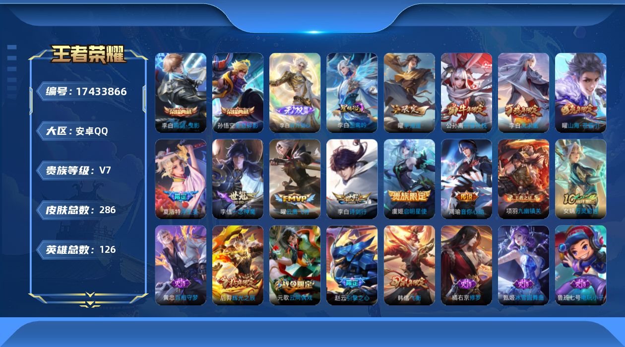 [17433866]【特价出售/店主推荐|钱包未注销|不包人脸】打野33段,安卓Q-V7-永恒钻石II段位-126英雄-286皮肤-2典藏皮肤-1无双-1星传说-10传说-70史诗