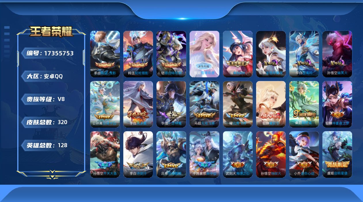 - [12037947]暑期末清货/特价急出/永久包赔贵族10/皮肤467/典藏6/传说44/史诗164/英雄126 武则天英雄,孙悟空全息碎影,小乔天鹅之梦,李白鸣剑曳影,诸葛亮星域神启,貂蝉幻阙歌,韩信弑枪猎影,马可波罗怪盗基德,鲁班七号江户川柯南,狄仁杰超时空战士,武则天海洋之心,孙悟空地狱火,宫本武藏地狱之眼,孙尚香末日机甲,貂蝉仲夏夜之梦,后羿黄金射手座,梦奇胖达荣荣,花木兰冠军飞将,达摩黄金狮子座,虞姬云霓雀翎,刘备时之恋人,镜炽阳神光,马超无双飞将,宫本武藏惊梅引,孙膑小动物乐团,露娜霜月吟,澜逐花归海,狄仁杰阴阳师,孙尚香异界灵契,高渐离死亡摇滚,高渐离玩趣恶龙,吕布天魔缭乱,项羽海滩派对,兰陵王影龙天霄,花木兰默契交锋,虞姬启明星使,诸葛亮武陵仙君,苏烈千军破阵,孙策挚爱之约,夏洛特浮生妄,王昭君永恒水手月亮,狄仁杰夜礼服假面,艾琳觅芳踪,吕布曦玄引,亚连落雪白狼,关羽决胜骁骑,百里玄策白虎志,孙悟空美猴王,裴擒虎寅虎赤拳,鲁班七号寅虎瑞焰,李白凤求凰,杨戬永曜之星,公孙离祈雪灵祝,诸葛亮时雨天司,伽罗太华,马超神威,孙尚香乘龙问璇玑,孙策乘龙淬吴钩,庄周蜃楼王,孙膑妖精王,扁鹊炼金王,芈月重明,夏侯惇朔风刀,曹操烛龙,典韦穷奇,狄仁杰万华元夜,达摩沙漠行僧,老夫子醍醐杖,程咬金演武夺筹,兰陵王金庭之子,张良古海寻踪,亚瑟狮心王,牛魔御旌,李元芳云中旅人,虞姬凯尔特女王,钟馗驱傩正仪,太乙真人饕餮,鬼谷子原初探秘者,弈星混沌棋,沈梦溪大漠名商,明世隐疑决卦,裴擒虎擒涛扼浪,狂铁御狮,米莱狄御霄,盾山御銮,鲁班大师探海日志,桑启海盐诗旅,鬼谷子天穹祈灯,刘邦剑破天穹,墨子神迹守卫,白起夜都怪侠,芈月幻夜卜梦,吕布猎兽之王,周瑜赤莲之焰,甄姬落雪兰心,达摩星际陆战队,刘邦夺宝奇兵,王昭君午后时光,艾琳流音漫舞,亚瑟潮玩骑士王,后羿圣弓游侠,钟馗神迹守卫,杨戬潮玩骑兵,女娲朔望之晖,雅典娜单词大作战,沈梦溪星空之诺,猪八戒西部大镖客,嫦娥暖冬兔眠,西施玲珑珍味,镜青焰无极,项羽苍威无极,鲁班七号电玩小子,项羽职棒王牌,项羽苍穹之光,露娜紫霞仙子,阿轲暗夜猫娘,钟无艳王者之锤,赵云嘻哈天王,赵云皇家上将,赵云未来纪元,貂蝉圣诞恋歌,甄姬冰雪圆舞曲,王昭君偶像歌手,狄仁杰魔术师,廉颇地狱岩魂,宫本武藏鬼剑武藏,孙尚香蔷薇恋人,孙尚香水果甜心,嬴政优雅恋人,嬴政暗夜贵公子,嬴政摇滚