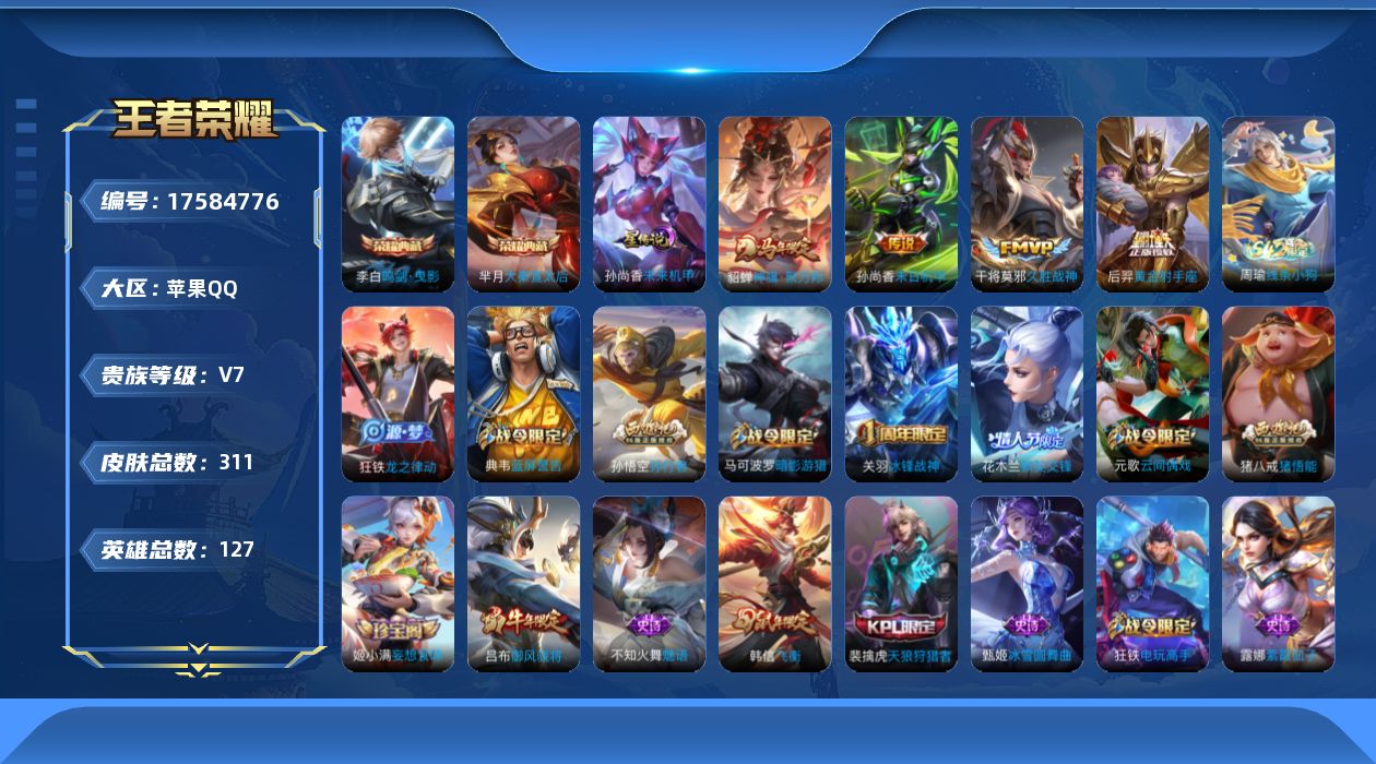 [17584776]可二次【特价出售/店主推荐/1省标/16市标/35段对抗/32段打野】:苹果Q-V7-最强王者段位-127英雄-311皮肤-1星元-2典藏皮肤-4传说-85史诗