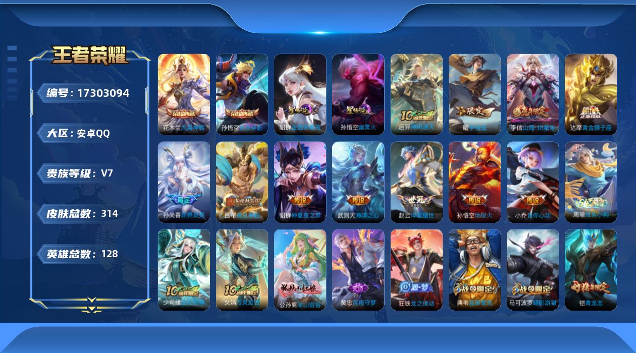 [17303094]【特价急出/详情看图】安卓Q-V7-永恒钻石V段位-128英雄-314皮肤-2典藏皮肤-1典藏英雄-2星元-11传说-81史诗