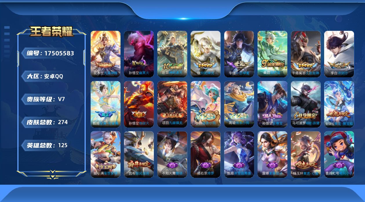 [17505583]可二次【特价出售/店主推荐】:安卓Q-V7-最强王者段位-125英雄-274皮肤-1典藏皮肤-8传说-1星传说-68史诗