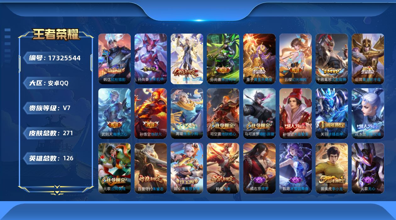 [17325544]【特价出售/店主推荐】安卓Q-V7-最强王者段位-126英雄-271皮肤-1典藏皮肤-1星传说-8传说-69史诗