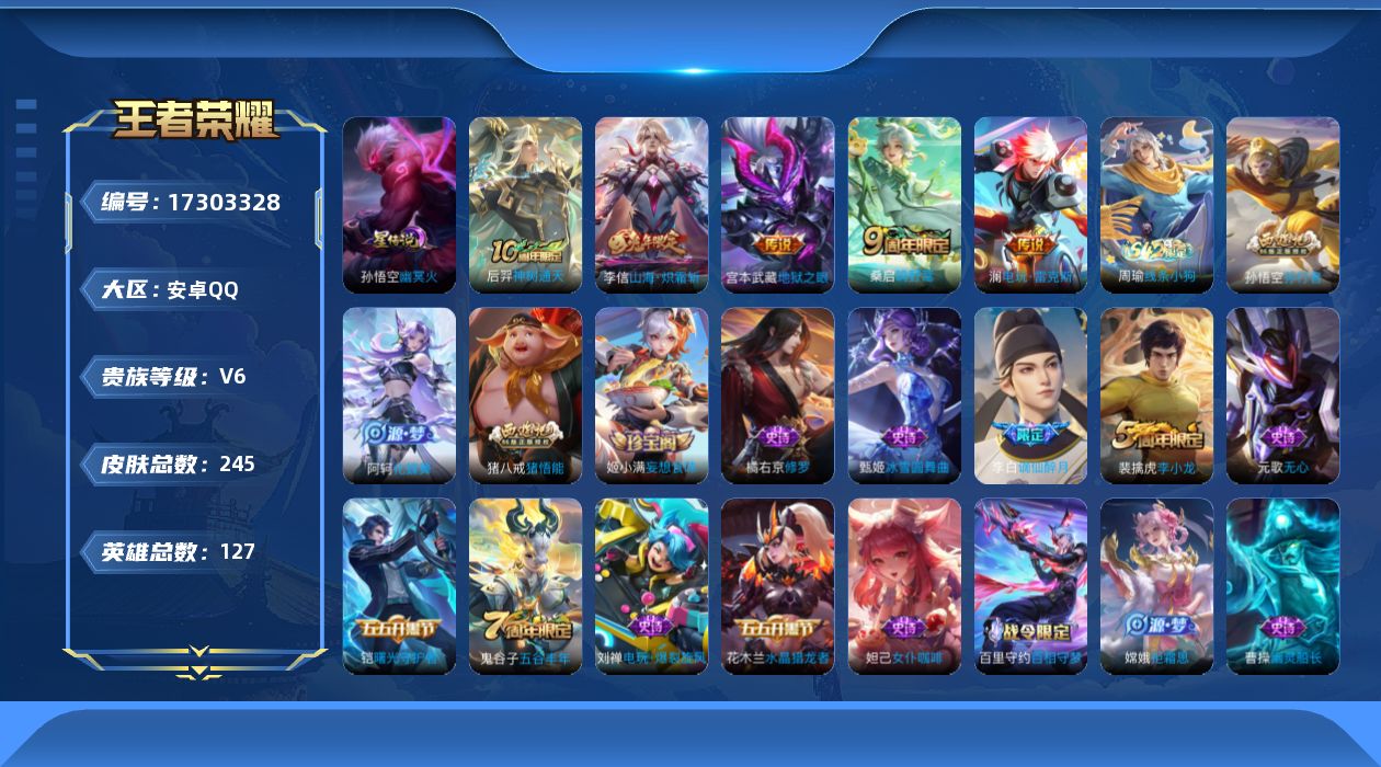 [17303328]【特价出售/店主推荐】安卓Q-V6-至尊星耀IV段位-127英雄-245皮肤-1星传说-5传说-51史诗
