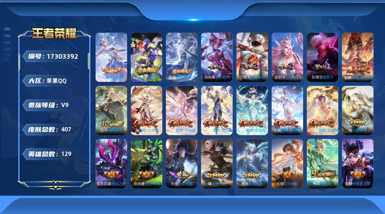 [17303392]【特价急出/详情看图】苹果Q-V9-永恒钻石II段位-129英雄-407皮肤-1典藏皮肤-1典藏英雄-4星元-2珍品传说-37传说-106史诗 【英雄全皮】:阿轲全皮,孙权全皮,敖隐全皮,司空震全皮,空空儿全皮,影全皮 【荣耀典藏】:武则天英雄,伽罗最初的交响 【珍品传说】:嫦娥器灵落星盏,孙策时之奇旅 【传说皮肤】:貂蝉神骥聚万邦,后羿神树通天,司空震愿照山河定,女娲愿照千秋盛,妲己愿照众生和,澜愿照九州拓,蔡文姬愿照福禄聚,虞姬愿照岁时盈,云缨幻光神枪,桑启鸣野蒿,庄周牧神诗旅,伽罗炽翼辉光,吕布怒海麟威,百里守约碎云,孙尚香音你闪耀,赵云淬星耀世,王昭君乞巧织情,西施游龙清影,周瑜音你心动,小乔音你心动,铠绛天战甲,镜炽阳神光,虞姬启明星使,曜云鹰飞将,李信一念神魔,刘备时之恋人,貂蝉猫影幻舞,张良黄金白羊座,干将莫邪久胜战神,花木兰冠军飞将,梦奇胖达荣荣,后羿黄金射手座,貂蝉仲夏夜之梦,孙尚香末日机甲,宫本武藏地狱之眼,孙悟空地狱火,武则天海洋之心 【限定皮肤】:白起狰,蒙犽顽岩魄,蔡文姬夏日便利店,大乔绒语心约,虞姬夏日便利店,姜子牙天穹之誓,李白谪仙醉月,狄仁杰阴阳师,虞姬凯尔特女王,赵云皇家上将,墨子神迹守卫,孙尚香蔷薇恋人,庄周蜃楼王,庄周高山流水,高渐离死亡摇滚,高渐离玩趣恶龙,阿轲迷踪丽影,孙膑妖精王,扁鹊炼金王,白起夜都怪侠,芈月幻夜卜梦,元歌无心,夏侯惇朔风刀,甄姬游园惊梦,甄姬落雪兰心,狄仁杰魔术师,达摩星际陆战队,达摩沙漠行僧,项羽海滩派对,老夫子航海奇遇记,程咬金演武夺筹,刘邦夺宝奇兵,兰陵王金庭之子,亚瑟狮心王,孙悟空孙行者,后羿圣弓游侠,李元芳云中旅人,虞姬启明星使,钟馗驱傩正仪,干将莫邪真爱魔法,太乙真人饕餮,苏烈千军破阵,弈星混沌棋,沈梦溪星空之诺,明世隐疑决卦,米莱狄胡桃异想国,瑶山海碧波行,云中君纤云弄巧,伽罗天狼溯光者,伽罗炽翼辉光,盾山御銮,猪八戒猪悟能,嫦娥拒霜思,嫦娥暖冬兔眠,桑启海盐诗旅,艾琳流音漫舞,司空震地狱燃心,阿古朵江河有灵,张良古海寻踪,蒙犽百解令,妲己灵卜魔法,鬼谷子天穹祈灯,伽罗琥珀纪元,沈梦溪龙舞盛年,周瑜熔金海岸 【年限皮肤】:瑶山海碧波行,司空震愿照山河定,女娲愿照千秋盛,妲己愿照众生和,澜愿照九州拓,蔡文姬愿照福禄聚,虞姬愿照岁时盈 【赛季限定】:亚瑟狮心王,庄周蜃楼王,孙膑妖精王,扁鹊炼金