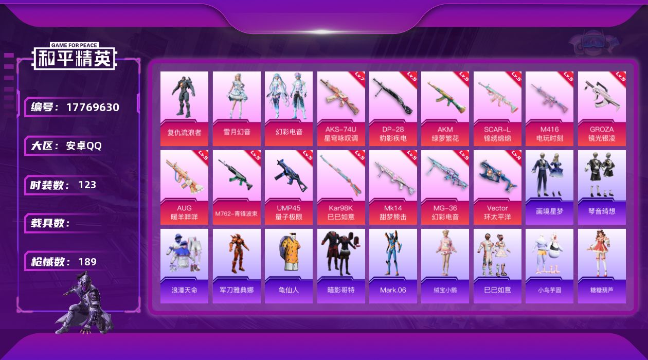 [17769630]安卓 手Q-3粉装-14特效枪-0载具-3粉色飞行器-54930热力值-7王牌印记-123套装-189枪皮 【热门品类】:套装-浪漫天命,角色-军刀雅典娜,套装-龟仙人,套装-暗影哥特,角色-Mark.06 【粉色套装】:角色-复仇流浪者,粉装-雪月幻音,粉装-幻彩电音 【粉色枪皮等级】:AKM-绿萝繁花(五级),SCAR-L-锦绣绵绵(五级),M416-电玩时刻(五级),GROZA-镜光银凌(五级),AUG-暖羊咩咩(五级),M762-青锋波束(五级),UMP45-量子极限(五级),Vector-环太平洋(四级),AKS-74U-星穹咏叹调(七级),AKS-74U-森灵之息(四级),Kar98K-巳巳如意(五级),Mk14-甜梦熊击(五级),DP-28-豹影疾电(五级),MG-36-幻彩电音(五级) 【粉色枪皮】:AKM-绿萝繁花,SCAR-L-锦绣绵绵,M416-电玩时刻,GROZA-镜光银凌,AUG-暖羊咩咩,M762-青锋波束,UMP45-量子极限,Vector-环太平洋,AKS-74U-星穹咏叹调,AKS-74U-森灵之息,Kar98K-巳巳如意,Mk14-甜梦熊击,DP-28-豹影疾电,MG-36-幻彩电音 【粉色飞行器】:极意拳锋飞行器 【粉色降落伞】:花间之火降落伞,洛神天依降落伞,环太平洋降落伞,圣堂之誓降落伞,精灵梦叶罗丽降落伞,临安公主降落伞,鬼刀降落伞,彩虹独角兽降落伞,月下星之子降落伞,星穹咏叹调降落伞,幻彩电音降落伞,炫彩糖果降落伞 【稀有套装】:套装-龟仙人,套装-绒宝小鹅,套装-巳巳如意,套装-小鸟芋圆,套装-炫彩糖果,套装-糖糖葫芦,套装-青团波波,套装-棉花软糖,角色-俏兔智灵,套装-燕燕于飞,套装-鱼渊荷华,角色-糖霜甜心,套装-粉恋花,套装-紫幽梦,套装-蓝冰羽,套装-霓虹热舞,套装-极速光影,套装-彩虹兔,套装-云朵鹅,套装-雪绒豹,套装-画境星梦,套装-琴音绮想 【稀有枪皮】:AUG-冰晶雪宝,AKM-彩虹符号,AKM-星之彼岸,AKM-环太平洋,AKM-生命誓言,AKM-破晓战魂,AKM-缤纷海域,AKM-虎虎生威,AKM-霓虹街区,AKM-龙的传人,M16A4-幻世战舞者,SCAR-L-夜灯,SCAR-L-炫彩节奏,SCAR-L-玉兔迎春,M416-糯团青竹,M416-红色方程式,M416-蓝色火焰,AUG-幻影战神