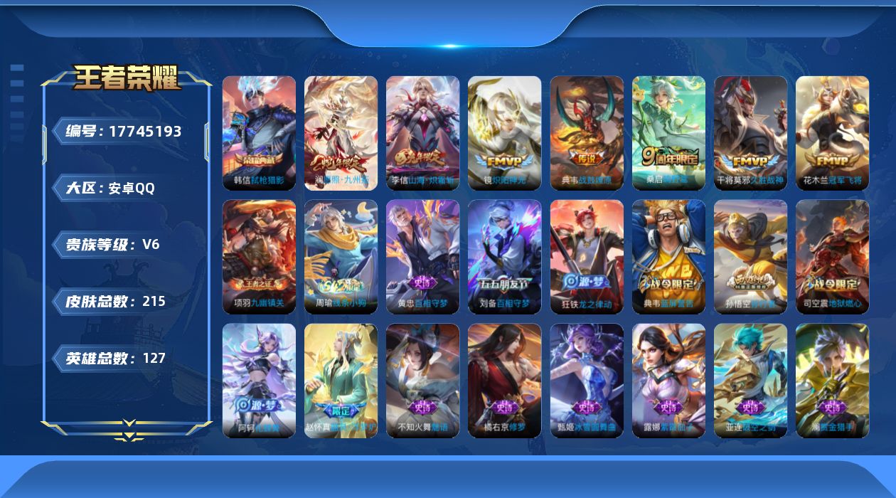 [17745193]【特价急出/详情看图】安卓Q-V6-最强王者段位-127英雄-215皮肤-1典藏皮肤-7传说-65史诗