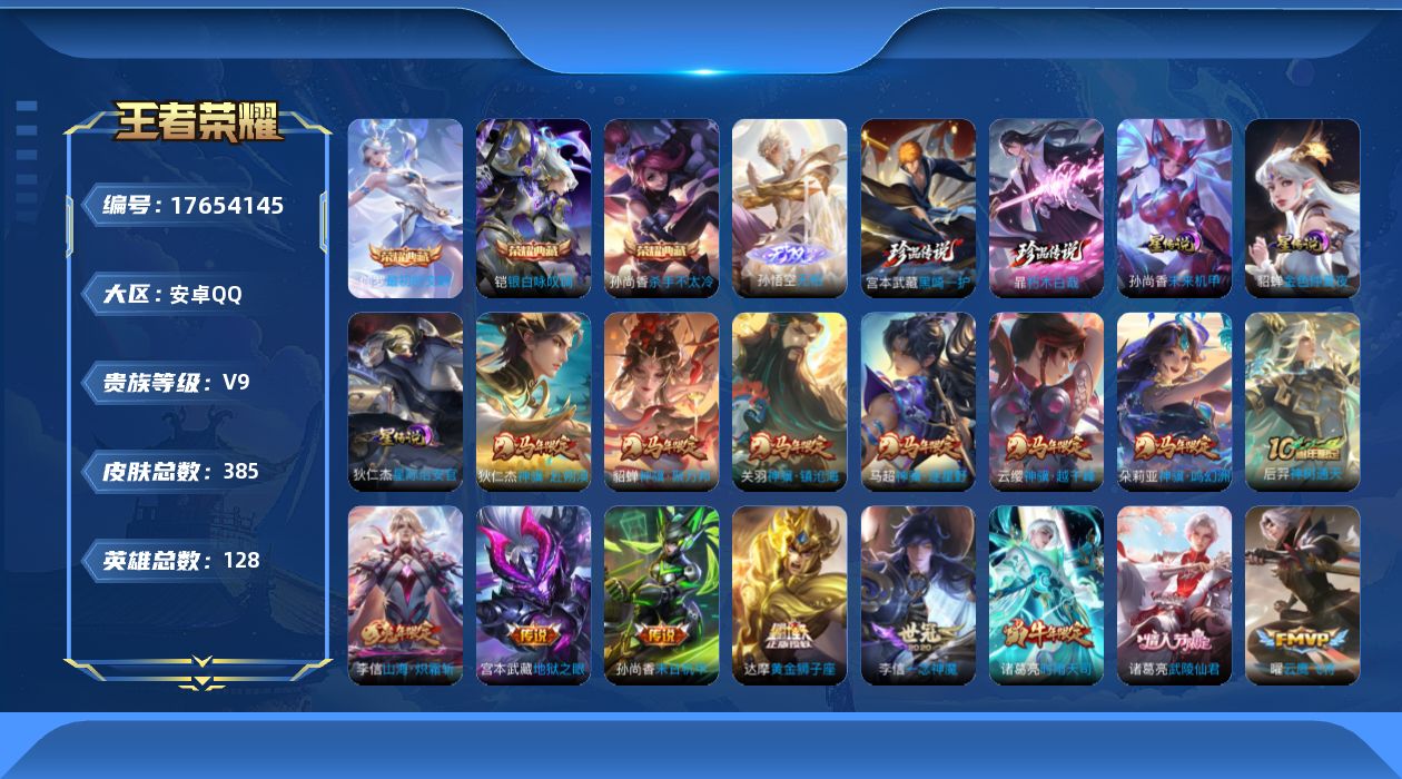 [17654145]【特价出售/店主推荐/1市标】:安卓Q-V9-最强王者段位-128英雄-385皮肤-3典藏皮肤-1无双-2珍品传说-3星元-26传说-112史诗
