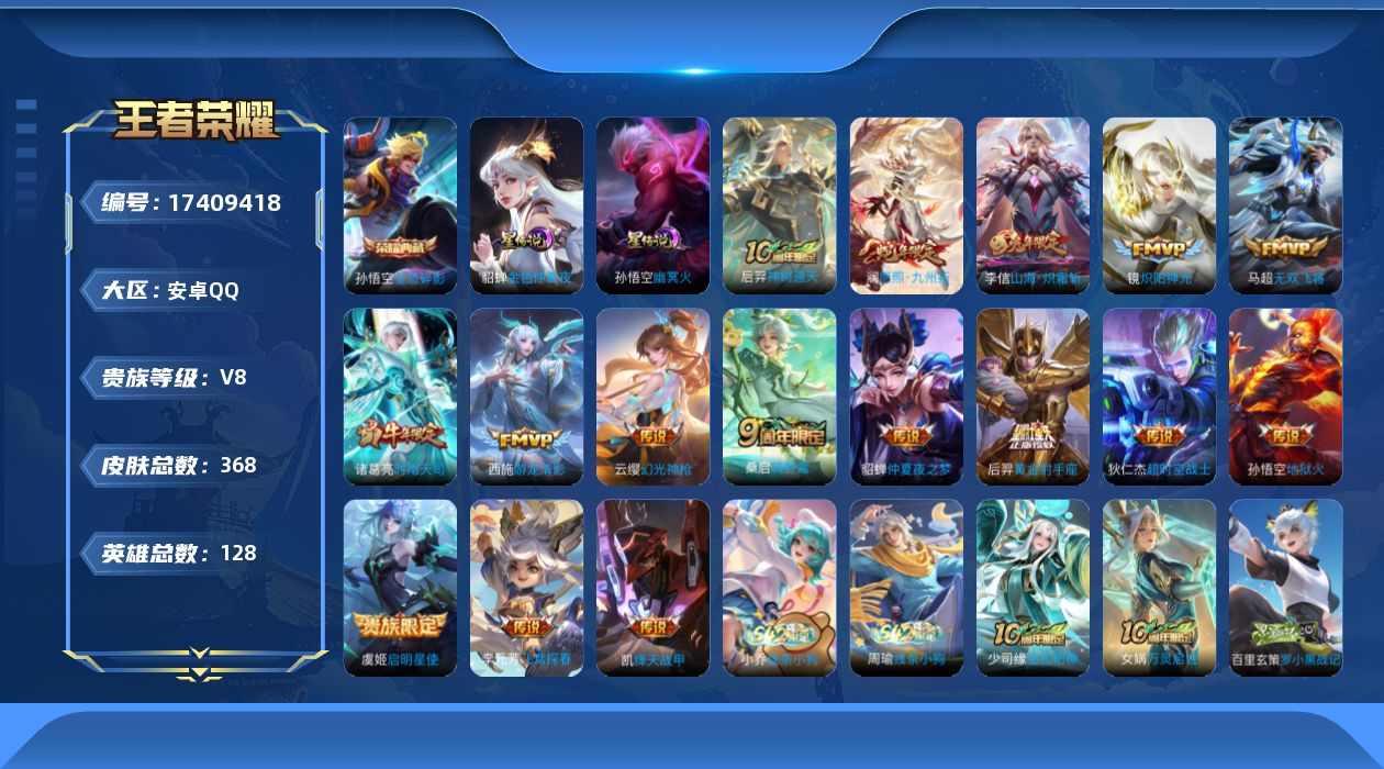 [17409418]【特价出售/店主推荐】安卓Q-V8-荣耀黄金I段位-128英雄-368皮肤-1典藏皮肤-16传说-89史诗-2星元
