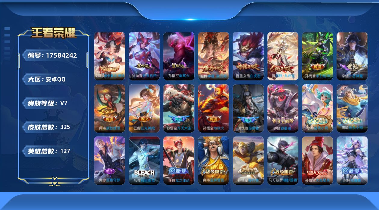 [17584242]可二次【特价出售/店主推荐】安卓Q-V7-至尊星耀II段位-127英雄-325皮肤-1典藏皮肤-2星传说-9传说-82史诗