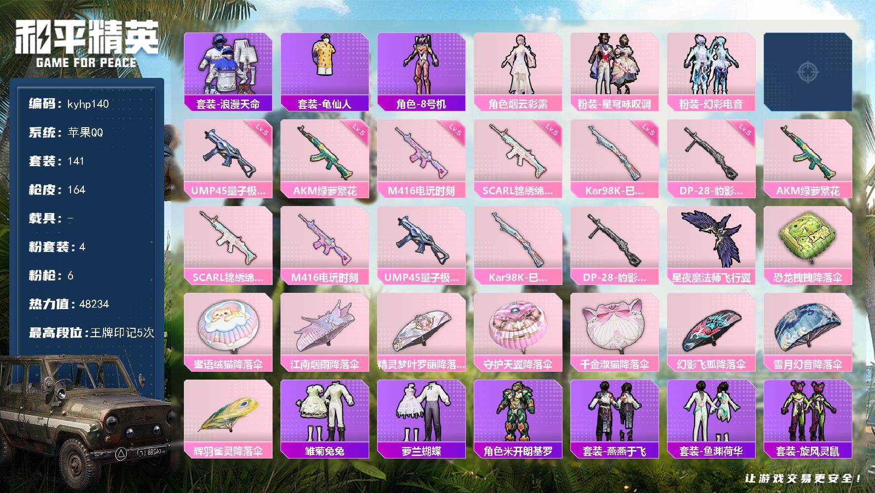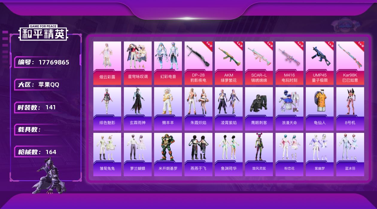 [17769865]苹果 手Q-4粉装-6特效枪-0载具-1粉色飞行器-48234热力值-5王牌印记-141套装-164枪皮