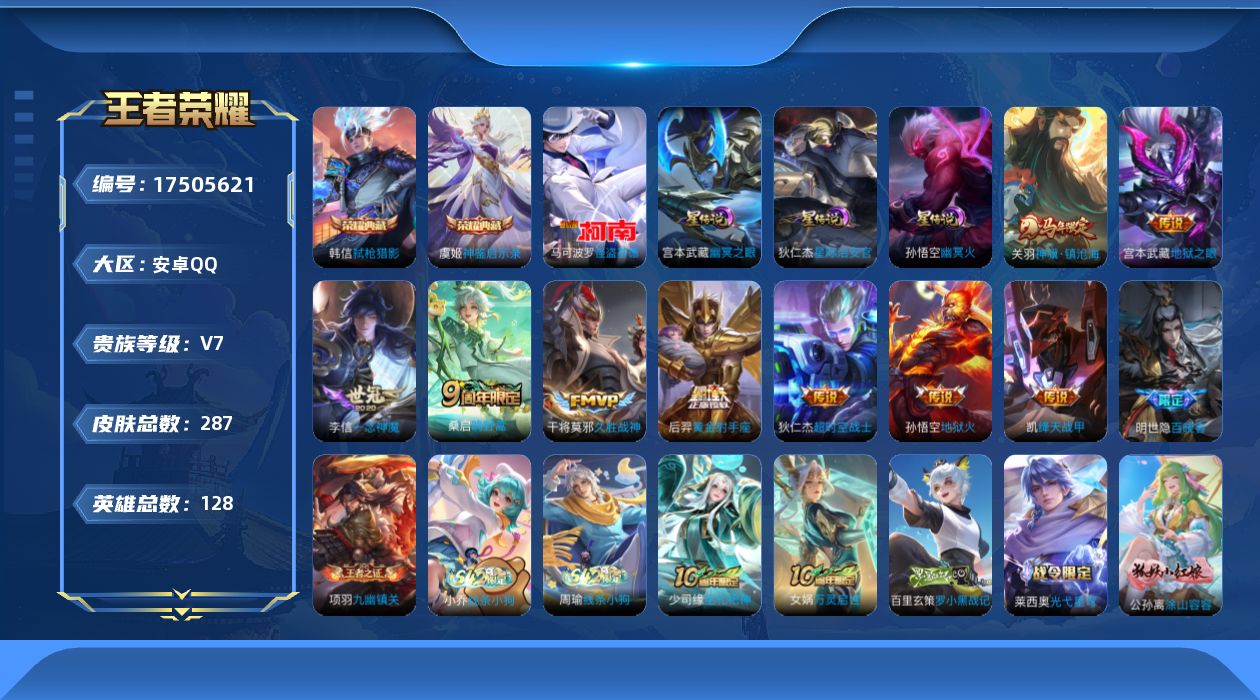 [17505621]可二次【特价出售/店主推荐】:安卓Q-V7-最强王者段位-128英雄-287皮肤-2典藏皮肤-1珍品传说-3星传说-9传说-99史诗
