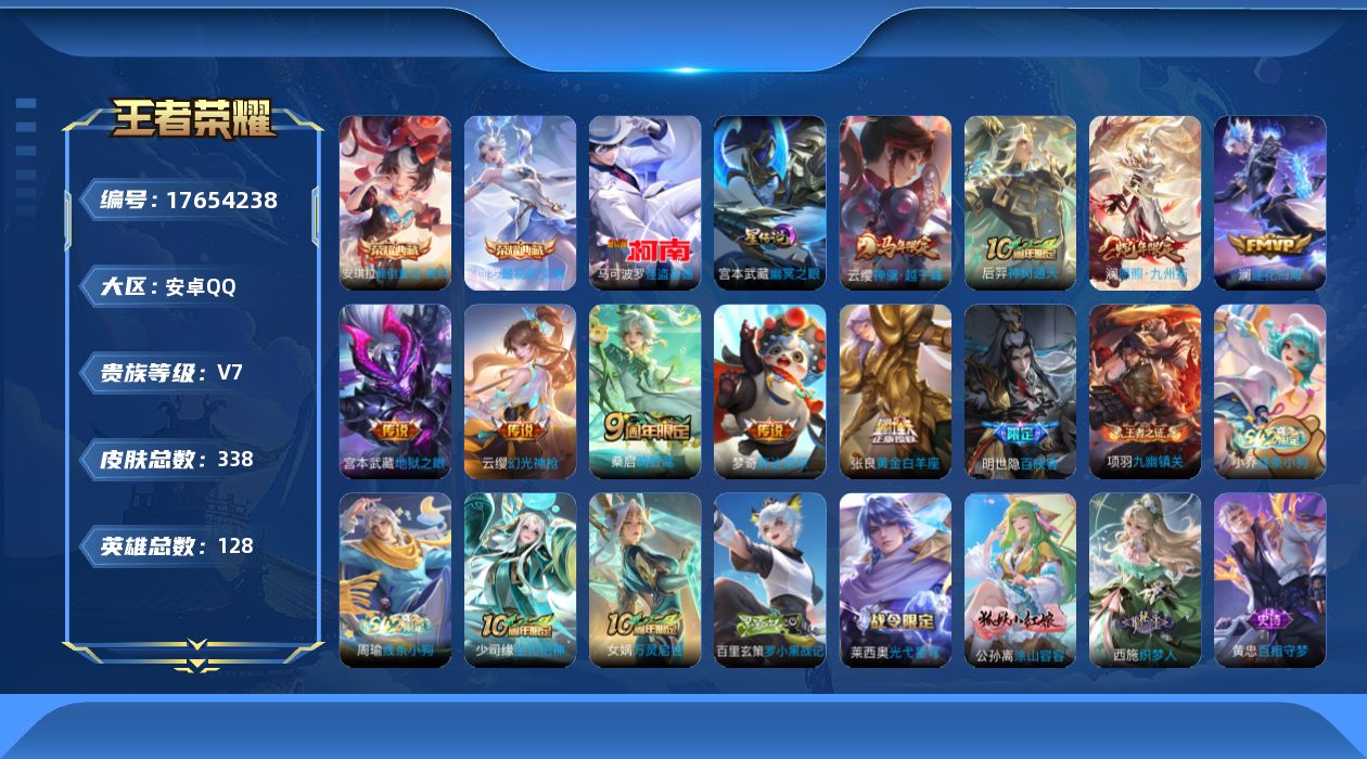 [17654238]【特价急出/详情看图】安卓Q-V7-最强王者段位-128英雄-338皮肤-2典藏皮肤-1星元-1珍品传说-9传说-77史诗