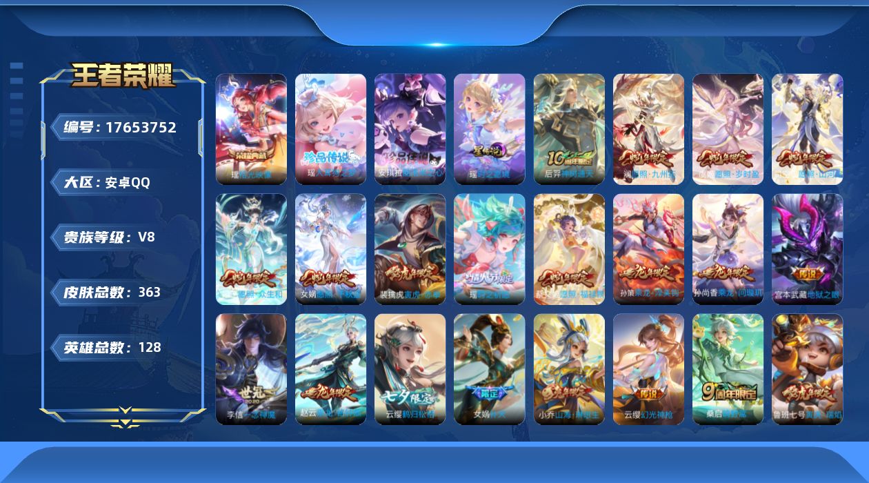 [17653752]可二次【特价出售/店主推荐】:安卓Q-V8-最强王者段位-128英雄-363皮肤-1典藏皮肤-2珍品传说-1星元-30传说-108史诗