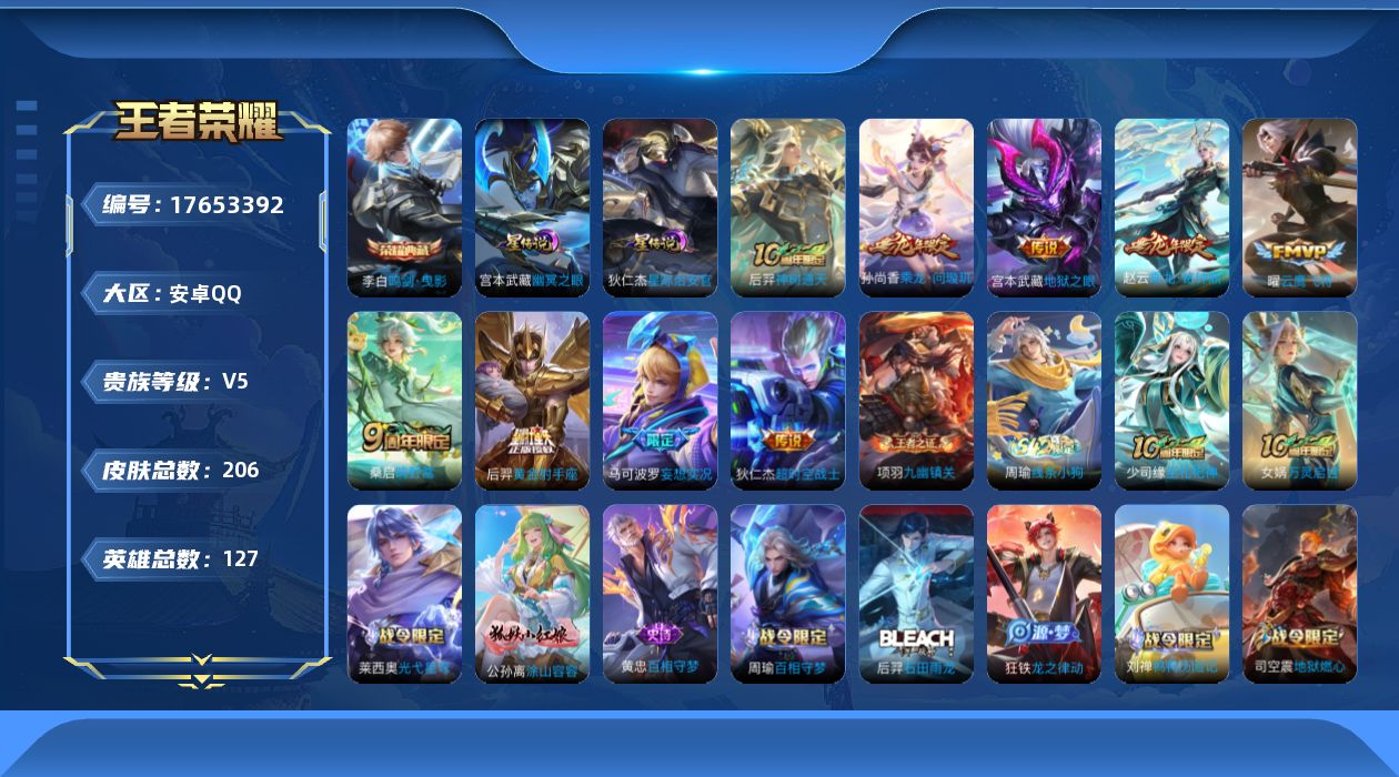 [17653392]【特价出售/店主推荐/1市标】:安卓Q-V6-最强王者段位-127英雄-206皮肤-1典藏皮肤-2星元-9传说-59史诗