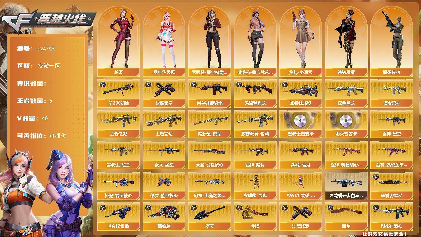 [17770004]【ky4758】安徽一区-48V-5王者-2炫金 【热门武器】:M200-幻神,M4A1-黑骑士*2,汤姆逊-烈龙*2,加特林-炼狱*3,沙鹰-修罗*3 【王者炫金武器】:王者之戮*2,超新星-悦享,王者之幻,玫瑰精灵-悦动,炫金黑龙,炫金雷神 【音效卡】:M4A1-黑骑士音效卡,Barrett-毁灭音效卡 【皮肤】:幻神-电竞之星 皮肤,雷神-暗月,雷神-星空,毁灭-星空,黑龙-暗月*2,黑骑士耀金皮肤,战神-粉色甜心皮肤,战神-紫绶金章皮肤,天龙-能量核心,极光-能量核心,修罗-能量核心 【角色】:风暴女,嘉年华灵狐,龙儿-小淘气,潘多拉-X,潘多拉-甜心教官,蛇姬,铁骑荣耀,新灵狐者,新娜塔莎,雪莉杨-摸金校尉,影武者-X 【人偶武器】:火麒麟-灵狐,AWM-灵狐-15周年嘉年华 【挑战大师】:冰龙粉碎者-白马银枪 【英雄级武器】:AK47-火麒麟,M4A1-黑龙*2,M4A1-雷神*4,M4A1-黑骑士*2,AK47-无影,AK47-黑武士,AK47-黑鲨,无影-神兵利器,M4A1-玫瑰精灵*3,AWM-天龙*2,Barrett-毁灭*2,Barrett-极光*2,M200-幻神,加特林-炼狱*3,汤姆逊-烈龙*2,AA-12-雷霆,沙鹰-修罗*3,屠龙*4,龙啸,擎天*2,麒麟刺,斩神刀-雷暴,高爆手雷-雷暴,闪光弹-雷暴,烟雾弹-雷暴 【道具】:CFS限定背包,亚洲杯纪念炫彩背包,冰冰企鹅背包,机械魔影背包-红色,炫彩背包,超级背包,女皇终结者-魔龙之吻,绿色巨人,生化弹匣,夺命之镰,防化服*2,金色流光-枪王排位*2,星辰流光-枪王排位,枪王排位28赛季金色流光,枪王排位29赛季金色流光,防弹头盔*2,防弹衣*2,C4工具钳*2,手雷包*2 【特殊枪械】:2黑骑士,2烈龙,3炼狱