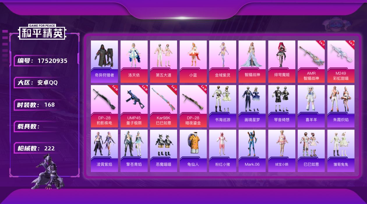 [17520935]安卓 手Q-6粉装-9特效枪-0载具-5粉色飞行器-73483热力值-10王牌印记-168套装-222枪皮