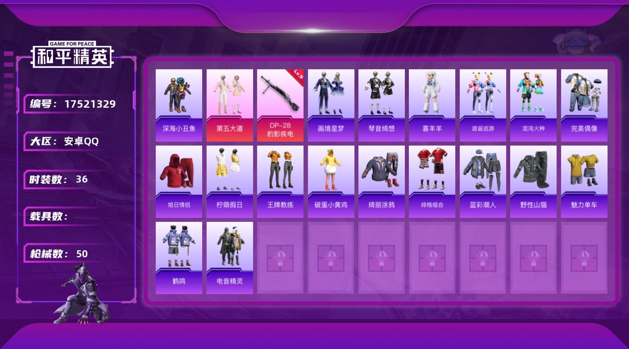 [17521329]安卓 手Q-2粉装-4特效枪-0载具-0粉色飞行器-14427热力值-1王牌印记-36套装-50枪皮