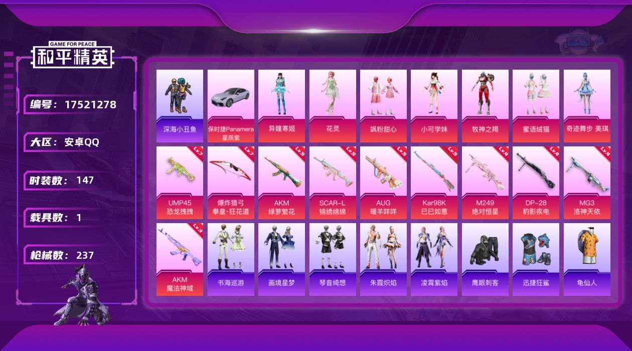 [17521278]安卓 手Q-7粉装-10特效枪-1载具-1粉色飞行器-72362热力值-14王牌印记-147套装-237枪皮 【热门品类】:套装-深海小丑鱼,套装-龟仙人 【粉色套装】:粉装-飒粉甜心,角色-小可学妹,粉装-牧神之羯,粉装-蜜语绒猫,角色-奇迹舞步 美琪,角色-花灵,角色-异瞳寒姬 【粉色枪皮等级】:AKM-绿萝繁花(五级),AKM-魔法神域(三级),SCAR-L-锦绣绵绵(五级),AUG-暖羊咩咩(五级),UMP45-恐龙拽拽(七级),Kar98K-巳巳如意(五级),M249-绝对恒星(四级),DP-28-豹影疾电(四级),MG3-洛神天依(四级),爆炸猎弓-拳皇·狂花道(七级) 【粉色载具】:保时捷Panamera(星辰紫) 【粉色枪皮】:AKM-绿萝繁花,AKM-魔法神域,SCAR-L-锦绣绵绵,AUG-暖羊咩咩,UMP45-恐龙拽拽,Kar98K-巳巳如意,M249-绝对恒星,DP-28-豹影疾电,MG3-洛神天依,爆炸猎弓-拳皇·狂花道 【粉色飞行器】:暮色之舞飞行器 【粉色降落伞】:至尊龙雀降落伞,神秘黑猫降落伞,夏日绵绵冰降落伞,梦之光华降落伞,洛神天依降落伞,翩跹演武降落伞,青空秋雨降落伞,纯梦嫁纱降落伞,仲夏莫吉托降落伞,梦幻舞会降落伞,白勺歌姬降落伞,南国舞曲降落伞,莲影清波降落伞,绝色倾城降落伞,炫彩糖果降落伞,暮色玫影降落伞,罪夜之冕降落伞 【稀有套装】:套装-龟仙人,套装-巳巳如意,套装-雪国风尚,套装-雏菊兔兔,套装-萝兰蝴蝶,套装-小熊娃娃,角色-都市丽猫,角色-摩登魅猫,套装-燕燕于飞,套装-鱼渊荷华,套装-紫幽梦,套装-蓝冰羽,套装-星渊小夜曲,套装-云朵鹅,套装-雪绒豹,套装-朱霞炽焰,套装-凌霄紫焰,套装-书海巡游,套装-画境星梦,套装-琴音绮想 【稀有枪皮】:AKM-小鹦鹉BEBE,AKM-破晓战魂,AKM-筑梦精灵,AKM-虎虎生威,AKM-霓虹街区,AKM-龙的传人,M16A4-幻世战舞者,M16A4-红色方程式,SCAR-L-玉兔迎春,SCAR-L-红色方程式,M416-糯团青竹,M416-红色方程式,M416-绯红前夜,M416-蓝色火焰,GROZA-懵萌河马,GROZA-田园牧歌,GROZA-暮色玫影,AUG-天降萌叽,AUG-耀粉歌者,AUG-闲梦青缨,AUG-绝对恒星,QBZ-洛神天依,QBZ-飞驰魅影,M76