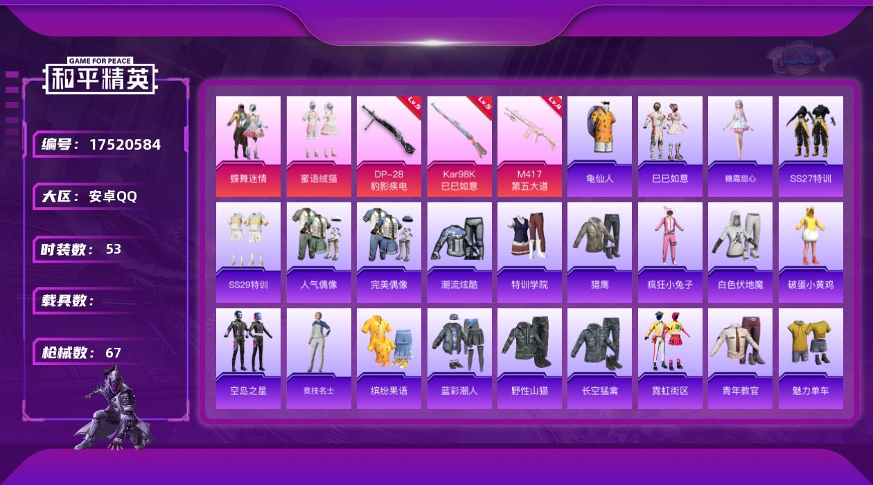 - PX_2088447- 包人脸 安卓手Q-1王牌印记-1粉装-4特效枪-0载具-24521热力值-45套装-98枪皮-0卓越印记-0传奇印记, 【1粉装】,星穹咏叹调, 【4特效枪】,GROZA-镜光银凌-5级,AUG-暖羊咩咩-5级,Kar98K-巳巳如意-5级,Mk14-甜梦熊击-5级, 【1稀有紫装】,龟仙人, 【45稀有时装】,蓝冰羽,星影赞美诗,紫幽梦,大橘大利,龟仙人,龙魂突击队,光矢