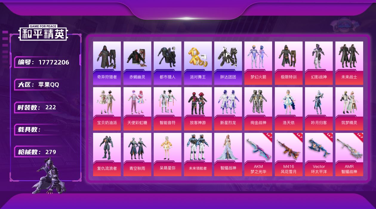 [17772206]苹果 手Q-18粉装-11特效枪-0载具-4粉色飞行器-98792热力值-17王牌印记-222套装-279枪皮