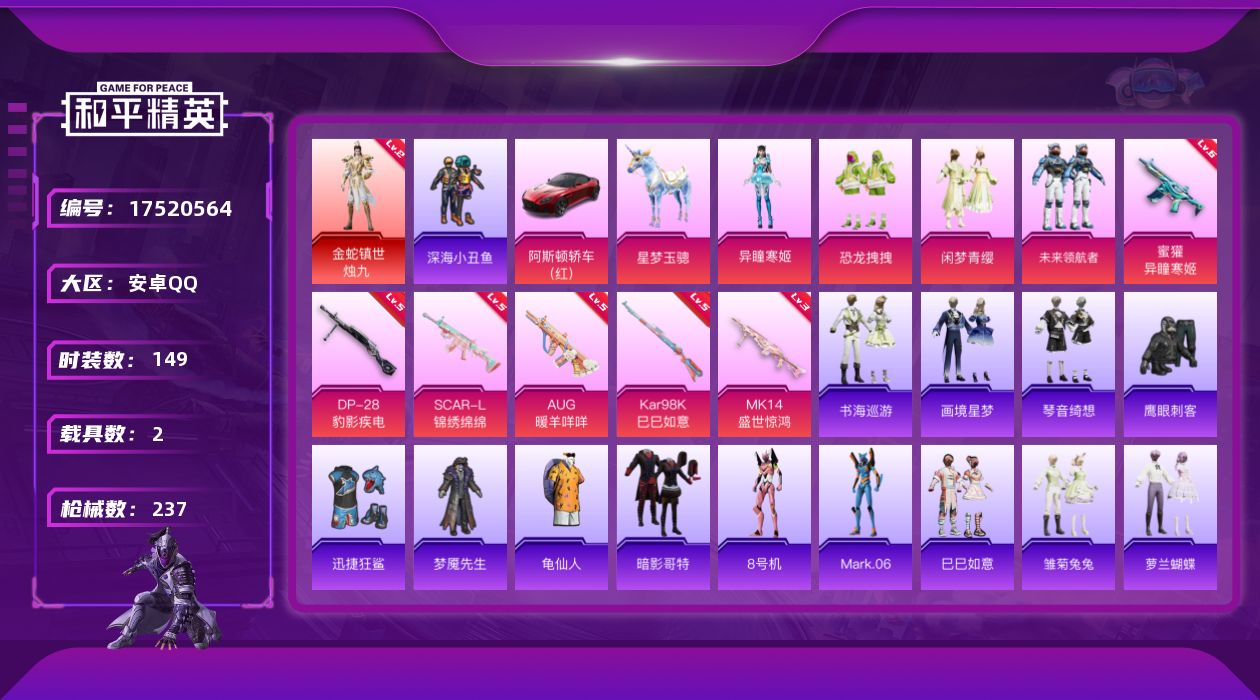 [17520564]安卓 手Q-1神装-4粉装-8特效枪-2载具-7粉色飞行器-75566热力值-14王牌印记-149套装-237枪皮 【红色神装等级】:金蛇镇世-烛九(二级) 【红色角色神装】:金蛇镇世-烛九 【热门品类】:套装-深海小丑鱼,套装-龟仙人,套装-暗影哥特,角色-8号机,角色-Mark.06 【粉色套装】:粉装-恐龙拽拽,粉装-闲梦青缨,粉装-未来领航者,角色-异瞳寒姬 【粉色枪皮等级】:SCAR-L-锦绣绵绵(五级),AUG-暖羊咩咩(五级),蜜獾-异瞳寒姬(六级),UMP45-萌骑冒险(四级),Kar98K-巳巳如意(五级),Mk14-盛世惊鸿(三级),Mk14-福马献瑞(五级),DP-28-豹影疾电(五级) 【粉色载具】:阿斯顿马丁DBS(红),星梦玉骢 【粉色枪皮】:SCAR-L-锦绣绵绵,AUG-暖羊咩咩,蜜獾-异瞳寒姬,UMP45-萌骑冒险,Kar98K-巳巳如意,Mk14-盛世惊鸿,Mk14-福马献瑞,DP-28-豹影疾电 【粉色飞行器】:酣梦熊熊飞行器,炫彩糖果飞行器,祥瑞起舞飞行器,黄族统领飞行器,夜幕颂歌飞行器,凤舞九天飞行器,万象金身飞行器 【粉色降落伞】:春暖花开降落伞,千面幻镜降落伞,音爆索尼克降落伞,拂晓神骑降落伞,江南烟雨降落伞,电糖天使降落伞,精灵梦叶罗丽降落伞,守护天翼降落伞,临安公主降落伞,月影灵韵降落伞,盛世惊鸿降落伞,金蛇镇世降落伞,鬼刀降落伞,樱桃泡泡降落伞,幻彩电音降落伞,冷漠罗丽降落伞,炫彩糖果降落伞 【稀有套装】:套装-龟仙人,套装-巳巳如意,套装-雪国风尚,套装-炫彩糖果,套装-马上有钱,套装-雏菊兔兔,套装-萝兰蝴蝶,套装-小熊娃娃,套装-糖糖葫芦,套装-青团波波,套装-棉花软糖,角色-都市丽猫,角色-摩登魅猫,角色-光矢逐梦,套装-燕燕于飞,套装-鱼渊荷华,套装-旋风灵鼠,套装-书海巡游,套装-画境星梦,套装-琴音绮想,套装-雨过天青,套装-红釉青花,角色-唐三,角色-朱竹清 【稀有枪皮】:AUG-冰晶雪宝,AKM-彩虹符号,AKM-影袭,AKM-江南烟雨,AKM-破晓战魂,AKM-缤纷海域,AKM-虎虎生威,AKM-霓虹街区,AKM-龙的传人,M16A4-幻世战舞者,M16A4-快乐主宰,M16A4-红色方程式,M16A4-蓝色火焰,M16A4-千金淑猫,SCAR-L-炫彩节奏,SCAR-L-玉兔迎春,SCAR-