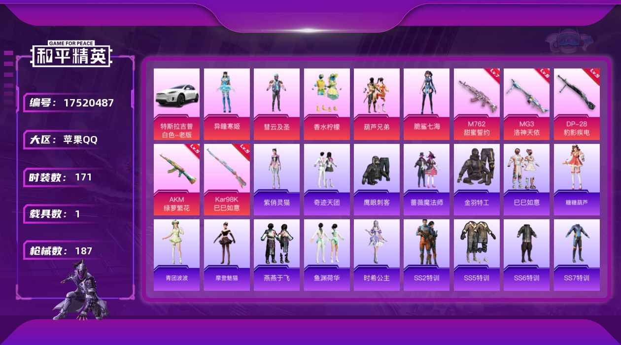 [17520487]苹果 手Q-无敌战神框-5粉装-9特效枪-1载具-0粉色飞行器-60864热力值-8王牌印记-171套装-187枪皮 【热门品类】:套装-金羽特工 【粉色套装】:粉装-彗云及圣,粉装-香水柠檬,粉装-葫芦兄弟,角色-脆鲨七海,角色-异瞳寒姬 【粉色枪皮等级】:AKM-绿萝繁花(五级),M762-甜蜜誓约(七级),ACE32-萌骑漫游(一级),UMP45-萌骑冒险(四级),Kar98K-巳巳如意(五级),AA12-G-萌骑幻想(一级),DP-28-豹影疾电(五级),MG3-洛神天依(六级),PKM-萌骑夺宝(一级) 【粉色载具】:特斯拉Model X(珍珠白) 【粉色枪皮】:AKM-绿萝繁花,M762-甜蜜誓约,ACE32-萌骑漫游,UMP45-萌骑冒险,Kar98K-巳巳如意,AA12-G-萌骑幻想,DP-28-豹影疾电,MG3-洛神天依,PKM-萌骑夺宝 【粉色降落伞】:凝视深渊降落伞,至尊龙雀降落伞,梦幻火箭降落伞,伏魔团降落伞,繁花小夜曲降落伞,马卡龙降落伞,潮汐统领降落伞,洛神天依降落伞,精灵梦叶罗丽降落伞,守护天翼降落伞,脆鲨七海降落伞,月影灵韵降落伞,冷漠罗丽降落伞,无垠阁降落伞,异瞳寒姬降落伞 【稀有套装】:套装-巳巳如意,套装-糖糖葫芦,套装-青团波波,角色-摩登魅猫,套装-燕燕于飞,套装-鱼渊荷华,角色-时希公主,角色-紫俏灵猫,套装-雨过天青,套装-红釉青花 【稀有枪皮】:AKM-夜灯,AKM-彩虹符号,AKM-生命誓言,AKM-虎虎生威,AKM-霓虹街区,M16A4-幻世战舞者,M16A4-机械英豪,M16A4-生命誓言,M16A4-莲影清波,SCAR-L-暗夜玫瑰,SCAR-L-炫彩节奏,SCAR-L-甜蜜誓约,SCAR-L-繁花小夜曲,SCAR-L-红色方程式,SCAR-L-黄金龙骨,SCAR-L-冷漠罗丽,M416-夜灯,M416-糯团青竹,M416-红色方程式,M416-绯红前夜,M416-蓝色火焰,GROZA-异彩先驱,GROZA-生命誓言,AUG-耀粉歌者,QBZ-原初圣火,QBZ-彩虹符号,QBZ-洛神天依,QBZ-神秘黑猫,M762-天降萌叽,M762-拳皇97,M762-深海曼妙,M762-牛气冲天,M762-瑞龙福将,M762-镭射皇者,Mk47-洛神天依,G36C-暗夜玫瑰,AC-VAL-快闪甜心,UZI-众神之王,UZ