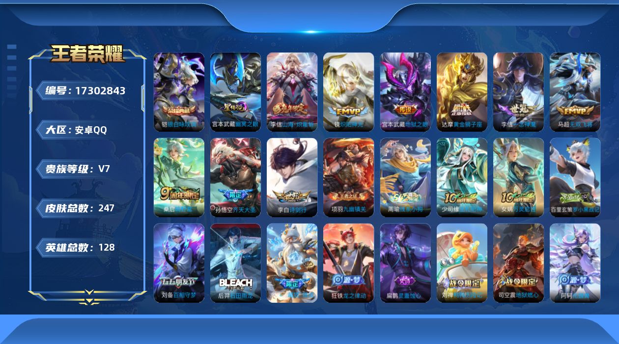 [17302843]可二次【特价出售/店主推荐 发育路35段 对抗路31段】安卓Q-V7-最强王者段位-128英雄-247皮肤-1典藏皮肤-1星传说-9传说-89史诗