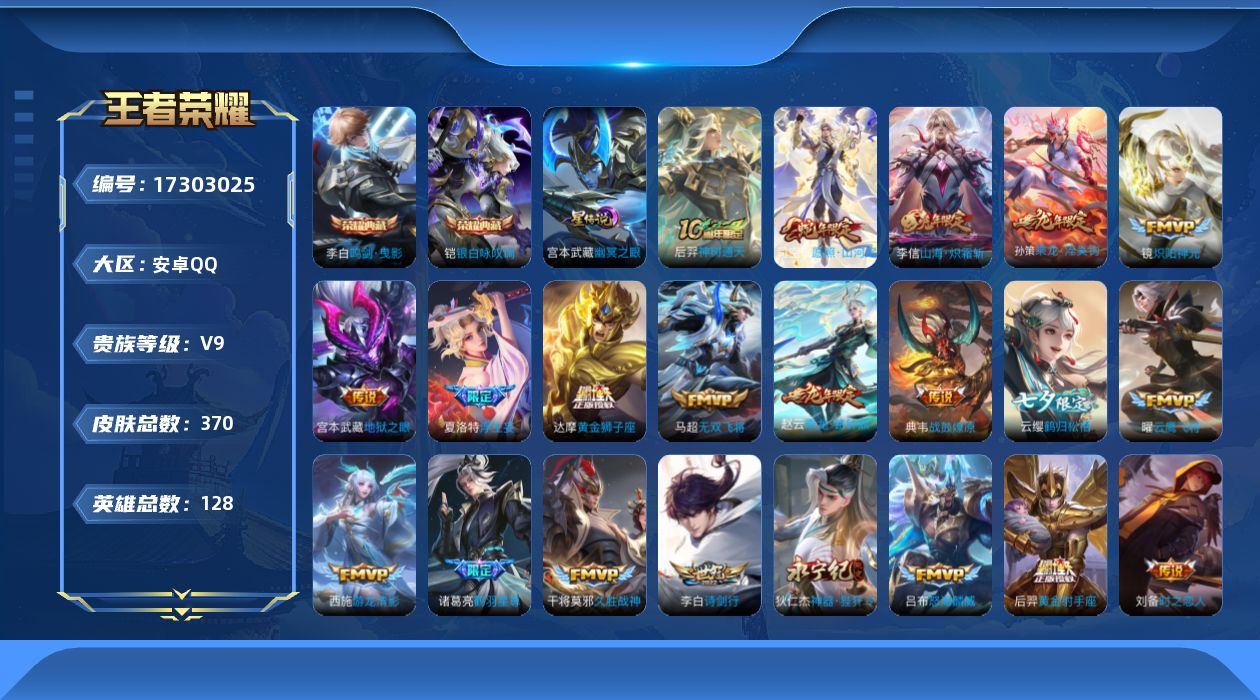 [17303025]【特价出售/店主推荐,打野19段,2市标】安卓Q-V9-至尊星耀IV段位-128英雄-370皮肤-1星传说-2典藏皮肤-34传说-109史诗 【英雄全皮】:孙权全皮,狂铁全皮,猪八戒全皮,夏洛特全皮,司空震全皮,戈娅全皮 【荣耀典藏】:李白鸣剑曳影,铠银白咏叹调 【传说皮肤】:后羿神树通天,司空震愿照山河定,典韦战鼓燎原,孙策乘龙淬吴钩,赵云乘龙铭钟鼎,云缨鹤归松栖,东皇太一灼幽烈阳,诸葛亮鹤羽星尊,亚瑟追逃游戏,夏洛特浮生妄,项羽无限倾心,李信山海炽霜斩,吕布怒海麟威,李白诗剑行,狄仁杰神器狴犴令,百里守约碎云,马超无双飞将,蔡文姬花朝如约,王昭君乞巧织情,西施游龙清影,周瑜音你心动,小乔音你心动,铠绛天战甲,镜炽阳神光,虞姬启明星使,曜云鹰飞将,刘备时之恋人,貂蝉猫影幻舞,干将莫邪久胜战神,虞姬云霓雀翎,达摩黄金狮子座,后羿黄金射手座,宫本武藏地狱之眼,孙悟空地狱火 【限定皮肤】:狄仁杰阴阳师,赵云皇家上将,赵云引擎之心,嬴政优雅恋人,钟无艳王者之锤,钟无艳超时空战士,扁鹊奇幻香踪,白起夜都怪侠,芈月重明,芈月白晶晶,吕布猎兽之王,吕布御风骁将,元歌云间偶戏,元歌无心,夏侯惇朔风刀,甄姬游园惊梦,甄姬落雪兰心,典韦岱宗,狄仁杰魔术师,狄仁杰神器狴犴令,达摩沙漠行僧,项羽海滩派对,项羽无限倾心,王昭君午后时光,兰陵王金庭之子,亚瑟追逃游戏,孙悟空美猴王,孙悟空至尊宝,孙悟空孙行者,李元芳匿光侦查者,李元芳云中旅人,虞姬启明星使,钟馗驱傩正仪,杨戬潮玩骑兵,蔡文姬繁星吟游,鬼谷子原初探秘者,鬼谷子五谷丰年,诸葛亮鹤羽星尊,黄忠烈魂,铠青龙志,苏烈千军破阵,弈星混沌棋,沈梦溪大漠名商,沈梦溪匿光破解者,明世隐疑决卦,明世隐吟游魔法,裴擒虎天狼狩猎者,裴擒虎李小龙,裴擒虎擒涛扼浪,狂铁御狮,狂铁电玩高手,米莱狄御霄,云中君纤云弄巧,李信山海炽霜斩,盾山御銮,猪八戒西部大镖客,猪八戒猪悟能,嫦娥拒霜思,嫦娥暖冬兔眠,西施玲珑珍味,鲁班大师探海日志,桑启海盐诗旅,夏洛特浮生妄,暃星界游侠,戈娅驭风魔法,艾琳流音漫舞,赵怀真鹤归松栖,云缨鹤归松栖,司空震地狱燃心,阿古朵江河有灵,张良古海寻踪,蒙犽百解令,蒙恬荣光圣徽,高渐离燃音魔法,妲己灵卜魔法,鬼谷子天穹祈灯,伽罗琥珀纪元,孙策乘龙淬吴钩,赵云乘龙铭钟鼎,沈梦溪龙舞盛年,鲁班七号蔬乡物语,李元芳蔬乡物语 【年限皮肤】:孙