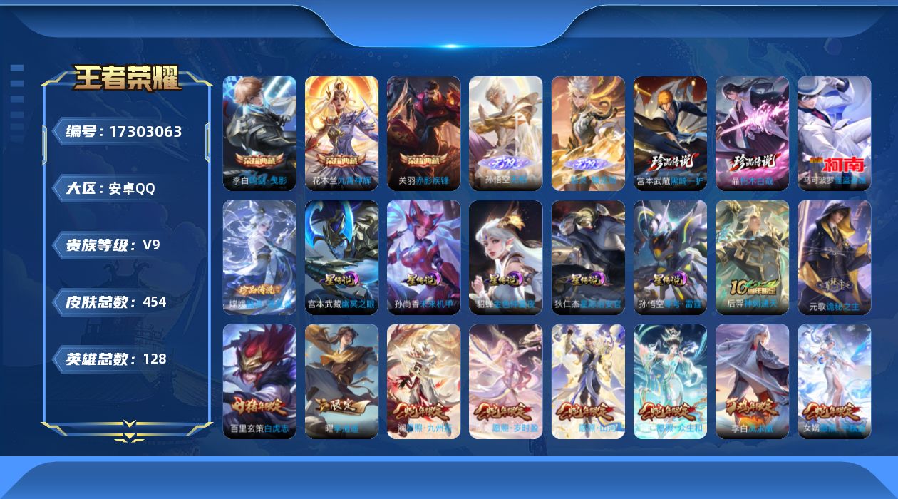 [17303063]【特价出售/店主推荐安卓,打野38段,发育路30段,1省标,16市标】Q-V9-至尊星耀III段位-128英雄-454皮肤-3典藏皮肤-6星传说-2无双-4珍品传说-53传说-145史诗 【英雄全皮】:嬴政全皮,刘禅全皮,元歌全皮,宫本武藏全皮,孙权全皮,钟馗全皮,太乙真人全皮,李信全皮,曜全皮,夏洛特全皮,空空儿全皮,影全皮 【荣耀典藏】:李白鸣剑曳影,花木兰九霄神辉,关羽赤影疾锋 【无双皮肤】:曜器灵螭龙剑,孙悟空无相 【珍品传说】:马可波罗怪盗基德,嫦娥器灵落星盏,暃朽木白哉,宫本武藏黑崎一护 【传说皮肤】:后羿神树通天,元歌诡秘之主,司空震愿照山河定,女娲愿照千秋盛,妲己愿照众生和,澜愿照九州拓,蔡文姬愿照福禄聚,虞姬愿照岁时盈,云缨幻光神枪,裴擒虎祥瑞亨通,嬴政玄雷天君,桑启鸣野蒿,澜逐花归海,露娜霜月吟,宫本武藏惊梅引,夏洛特浮生妄,干将莫邪画中仙,孙悟空齐天大圣,曜山海苍雷引,李信山海炽霜斩,不知火舞绯月行,马可波罗深海之息,马超无双飞将,裴擒虎寅虎赤拳,孙尚香异界灵契,赵云淬星耀世,曜李逍遥 ,李元芳飞鸢探春,诸葛亮时雨天司,镜炽阳神光,虞姬启明星使,孙悟空零号赤焰,关羽武圣,曜云鹰飞将,李信一念神魔,刘备时之恋人,伽罗太华,貂蝉猫影幻舞,张良黄金白羊座,干将莫邪久胜战神,虞姬云霓雀翎,达摩黄金狮子座,百里玄策白虎志,梦奇胖达荣荣,后羿黄金射手座,诸葛亮武陵仙君,貂蝉仲夏夜之梦,李白凤求凰,孙尚香末日机甲,宫本武藏地狱之眼,孙悟空地狱火,吕布天魔缭乱,狄仁杰超时空战士 【限定皮肤】:白起狰,大乔绒语心约,姜子牙天穹之誓,李白谪仙醉月,狄仁杰阴阳师,小乔纯白花嫁,赵云皇家上将,赵云引擎之心,墨子神迹守卫,妲己时之彼端,嬴政优雅恋人,嬴政白昼王子,孙尚香异界灵契,鲁班七号狮舞东方,庄周高山流水,高渐离死亡摇滚,钟无艳超时空战士,白起夜都怪侠,芈月重明,芈月幻夜卜梦,吕布天魔缭乱,吕布猎兽之王,吕布御风骁将,周瑜真爱至上,周瑜赤莲之焰,元歌云间偶戏,元歌无心,夏侯惇朔风刀,甄姬游园惊梦,甄姬落雪兰心,曹操烛龙,典韦穷奇,典韦蓝屏警告,马可波罗逐梦之星,马可波罗暗影游猎,马可波罗深海之息,狄仁杰魔术师,狄仁杰万华元夜,达摩沙漠行僧,项羽海滩派对,老夫子醍醐杖,老夫子航海奇遇记,关羽冰锋战神,关羽武圣,程咬金演武夺筹,韩信逐梦之影,韩信飞衡,韩信傲雪梅枪,兰