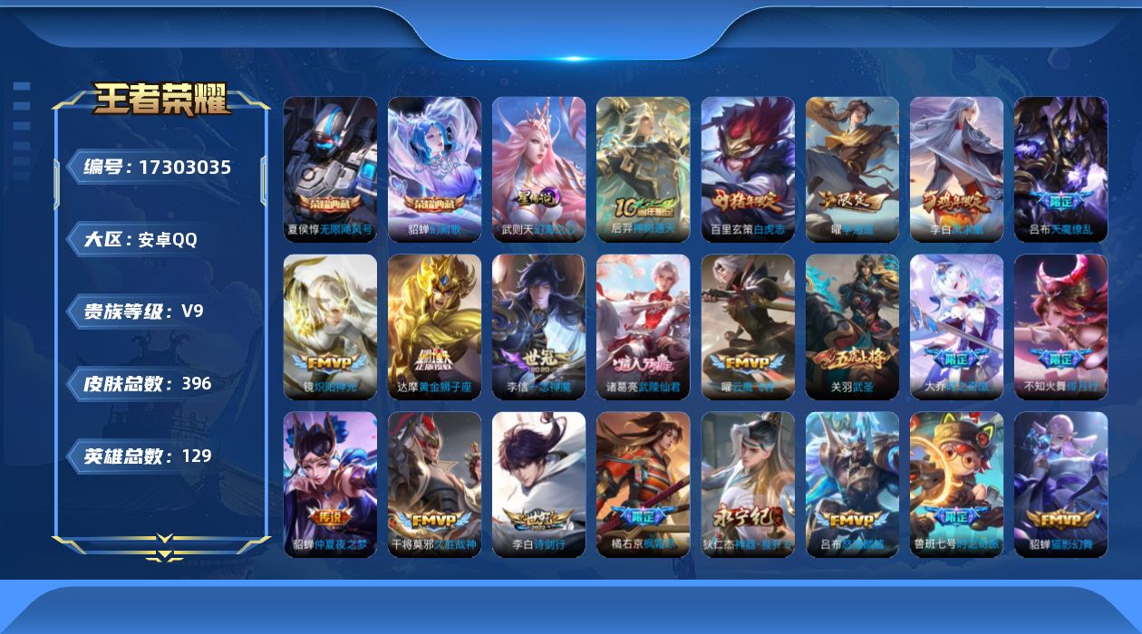 - [13865854]安卓Q-V7-至尊星耀IV段位-122英雄-225皮肤-0典藏-0珍品无双-0无双-0珍品传说-4传说-50史诗 【传说皮肤】:桑启鸣野蒿,李信山海炽霜斩,李白诗剑行,虞姬云霓雀翎 【限定皮肤】:姜子牙天穹之誓,狄仁杰阴阳师,赵云皇家上将,墨子神迹守卫,嬴政白昼王子,鲁班七号狮舞东方,芈月幻夜卜梦,吕布猎兽之王,周瑜赤莲之焰,元歌无心,夏侯惇朔风刀,典韦蓝屏警告,狄仁杰魔术师,狄仁杰万华元夜,达摩沙漠行僧,项羽海滩派对,老夫子醍醐杖,老夫子航海奇遇记,程咬金演武夺筹,兰陵王金庭之子,孙悟空大圣娶亲,牛魔御旌,后羿圣弓游侠,李元芳云中旅人,钟馗神迹守卫,钟馗驱傩正仪,女娲朔望之晖,干将莫邪胡桃夹子,雅典娜黎明之约,蔡文姬繁星吟游,鬼谷子原初探秘者,鬼谷子五谷丰年,黄忠火炮绅士,苏烈千军破阵,百里玄策原初追逐者,弈星混沌棋,梦奇顽趣,沈梦溪大漠名商,明世隐疑决卦,裴擒虎擒涛扼浪,狂铁御狮,米莱狄御霄,云中君纤云弄巧,李信山海炽霜斩,伽罗天狼溯光者,盾山御銮,上官婉儿梁祝,上官婉儿天狼绘梦者,鲁班大师探海日志,桑启海盐诗旅,阿古朵江河有灵,张良古海寻踪,蒙犽百解令,蒙恬荣光圣徽,鬼谷子天穹祈灯,沈梦溪龙舞盛年,刘邦剑破天穹,周瑜熔金海岸 【年限皮肤】:李信山海炽霜斩 【赛季限定】:夏侯惇朔风刀,狄仁杰万华元夜,达摩沙漠行僧,老夫子醍醐杖,程咬金演武夺筹,兰陵王金庭之子,张良古海寻踪,牛魔御旌,李元芳云中旅人,钟馗驱傩正仪,雅典娜黎明之约,鬼谷子原初探秘者,苏烈千军破阵,百里玄策原初追逐者,弈星混沌棋,梦奇顽趣,沈梦溪大漠名商,明世隐疑决卦,裴擒虎擒涛扼浪,狂铁御狮,米莱狄御霄,盾山御銮,鲁班大师探海日志,桑启海盐诗旅,鬼谷子天穹祈灯,蒙恬荣光圣徽,刘邦剑破天穹,姜子牙天穹之誓 【战令限定】:墨子神迹守卫,嬴政白昼王子,鲁班七号狮舞东方,芈月幻夜卜梦,吕布猎兽之王,周瑜赤莲之焰,典韦蓝屏警告,老夫子航海奇遇记,后羿圣弓游侠,钟馗神迹守卫,女娲朔望之晖,黄忠火炮绅士 【史诗皮肤】:阿轲暗夜猫娘,赵云皇家上将,貂蝉圣诞恋歌,甄姬冰雪圆舞曲,王昭君偶像歌手,狄仁杰魔术师,宫本武藏鬼剑武藏,孙尚香水果甜心,妲己魅力维加斯,墨子龙骑士,墨子金属风暴,吕布圣诞狂欢,曹操幽灵船长,韩信白龙吟,花木兰水晶猎龙者,夏侯惇乘风破浪,兰陵王暗隐猎兽者,雅典娜冰冠公主,百里守约特工魅影,李元芳逐