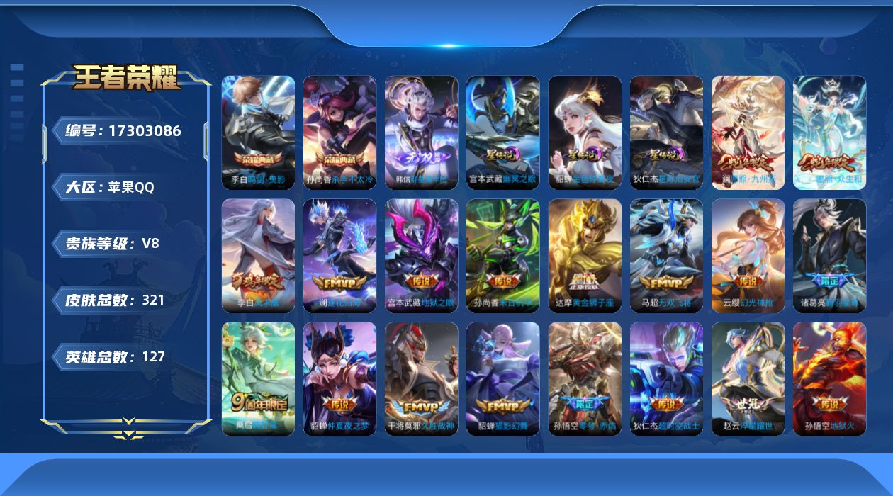 [17303086]【店主推荐捡漏号!可直接换绑】苹果Q-V8-至尊星耀V段位-127英雄-321皮肤-2典藏皮肤-1无双-20传说-73史诗-3星元