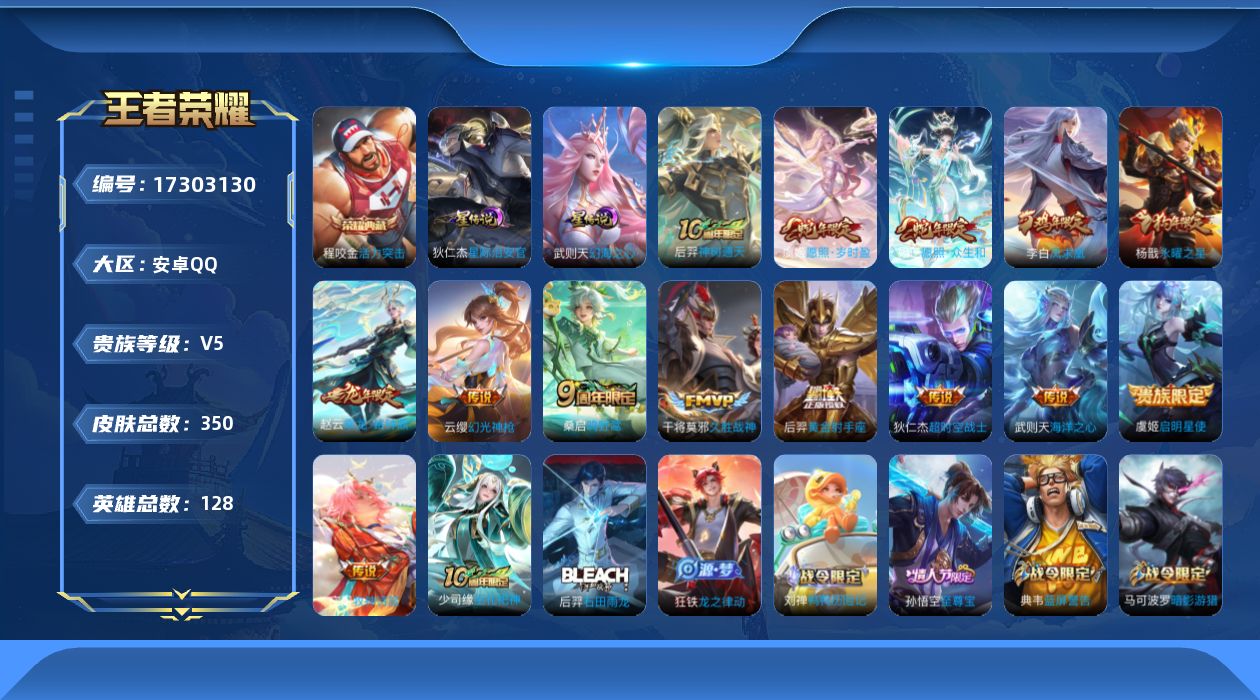 - [16392290]【特价出售/店主推荐】安卓Q-V10-最强王者段位-128英雄-454皮肤-8典藏皮肤-1典藏英雄-6星传说-51传说-153史诗 【英雄全皮】:刘邦全皮,娜可露露全皮,橘右京全皮,太乙真人全皮,猪八戒全皮,影全皮 【荣耀典藏】:武则天英雄,孙悟空全息碎影,武则天倪克斯神谕,夏侯惇无限飓风号,小乔天鹅之梦,孙尚香杀手不太冷,李白鸣剑曳影,诸葛亮星域神启,韩信弑枪猎影 【传说皮肤】:后羿神树通天,桑启鸣野蒿,艾琳觅芳踪,不知火舞绯月行,百里守约碎云,橘右京枫霜尽,娜可露露前尘镜,马可波罗深海之息,大乔挚爱花嫁,孙策挚爱之约,露娜启示之音,蔡文姬花朝如约,女娲补天,孙策末日机甲,瑶时之祈愿,裴擒虎寅虎赤拳,鲁班七号寅虎瑞焰,孙尚香异界灵契,貂蝉遇见胡旋,赵云淬星耀世,王昭君乞巧织情,西施游龙清影,曜李逍遥 ,周瑜音你心动,小乔音你心动,李元芳飞鸢探春,公孙离祈雪灵祝,诸葛亮时雨天司,铠绛天战甲,镜炽阳神光,虞姬启明星使,孙悟空零号赤焰,关羽武圣,李信一念神魔,伽罗太华,貂蝉猫影幻舞,张良黄金白羊座,干将莫邪久胜战神,虞姬云霓雀翎,达摩黄金狮子座,花木兰冠军飞将,后羿黄金射手座,杨戬永曜之星,诸葛亮武陵仙君,貂蝉仲夏夜之梦,李白凤求凰,孙尚香末日机甲,宫本武藏地狱之眼,孙悟空地狱火,吕布天魔缭乱,武则天海洋之心 【限定皮肤】:白起狰,姜子牙天穹之誓,狄仁杰阴阳师,小乔纯白花嫁,虞姬凯尔特女王,廉颇寅虎御盾,赵云皇家上将,赵云百木心枪,墨子神迹守卫,妲己时之彼端,妲己时之奇旅,嬴政优雅恋人,孙尚香蔷薇恋人,孙尚香异界灵契,鲁班七号狮舞东方,鲁班七号乒乒小将,鲁班七号寅虎瑞焰,庄周玄嵩,庄周高山流水,高渐离死亡摇滚,阿轲迷踪丽影,钟无艳超时空战士,孙膑妖精王,孙膑天狼运算者,孙膑寅虎展翼,扁鹊炼金王,白起夜都怪侠,芈月重明,芈月白晶晶,芈月幻夜卜梦,吕布天魔缭乱,吕布御风骁将,周瑜真爱至上,周瑜赤莲之焰,元歌云间偶戏,元歌无心,夏侯惇朔风刀,夏侯惇匿光决锋者,甄姬幽恒,甄姬女儿国国王,甄姬游园惊梦,甄姬落雪兰心,曹操烛龙,曹操天狼征服者,典韦穷奇,典韦蓝屏警告,典韦岱宗,马可波罗逐梦之星,马可波罗暗影游猎,马可波罗深海之息,狄仁杰魔术师,狄仁杰万华元夜,达摩星际陆战队,达摩沙漠行僧,项羽海滩派对,项羽霸王别姬,老夫子醍醐杖,老夫子航海奇遇记,关羽冰锋战神,关羽武圣,貂蝉遇见