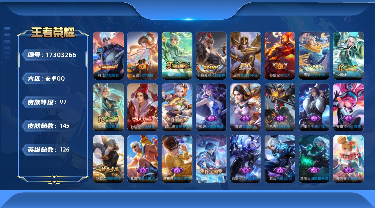 [17303266]【特价出售/店主推荐】安卓Q-V7-至尊星耀V段位-126英雄-145皮肤-1典藏皮肤-5传说-32史诗