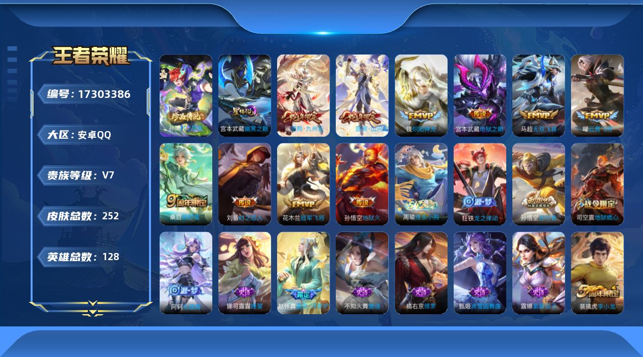 [17303386]【特价急出/详情看图】安卓Q-V7-至尊星耀V段位-128英雄-252皮肤-1珍品传说-1星元-10传说-61史诗