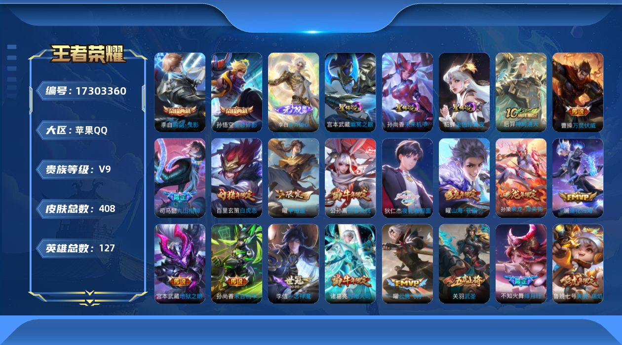 [17303360]【特价急出/详情看图】苹果Q-V9-至尊星耀V段位-127英雄-408皮肤-2典藏皮肤-1无双-3星元-30传说-123史诗