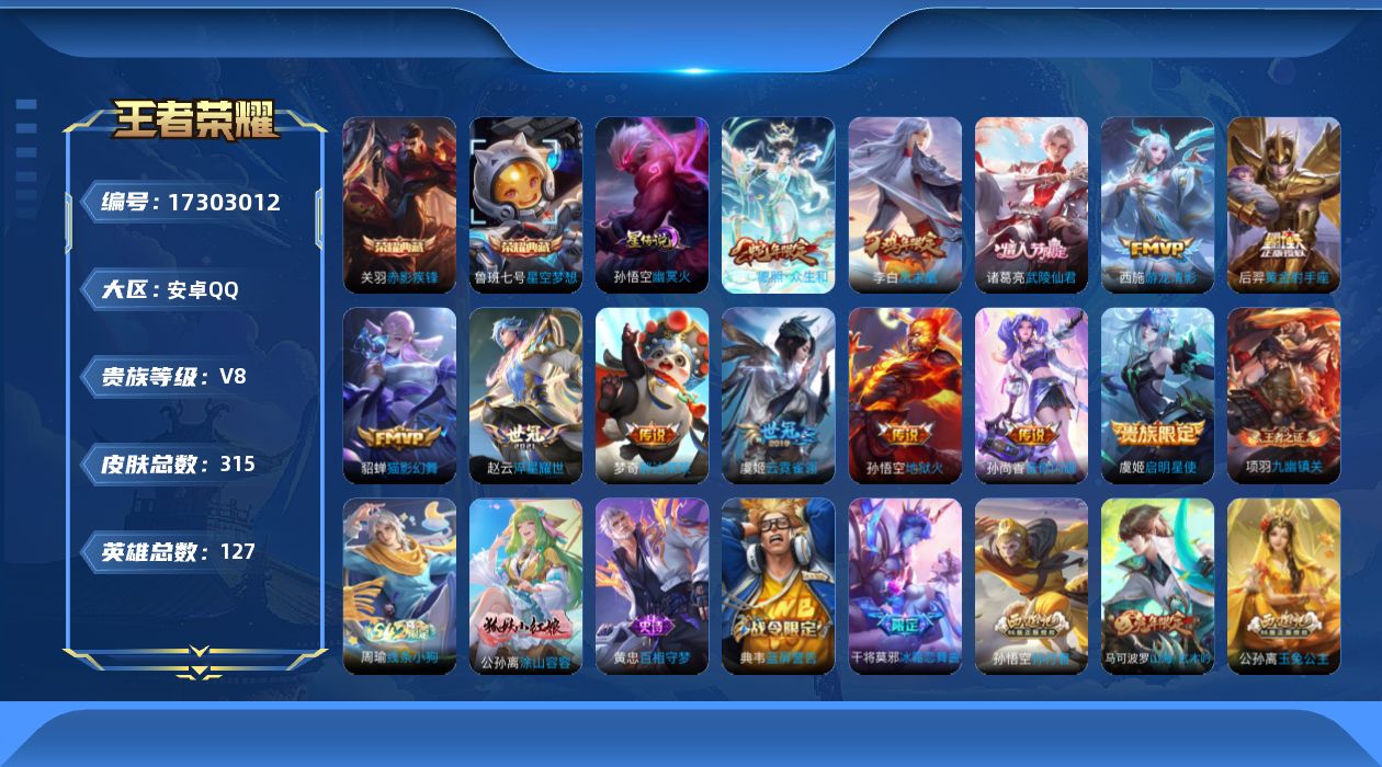 [17303012]【特价急出/详情看图】安卓Q-V8-永恒钻石II段位-127英雄-315皮肤-2典藏皮肤-1星元-12传说-78史诗
