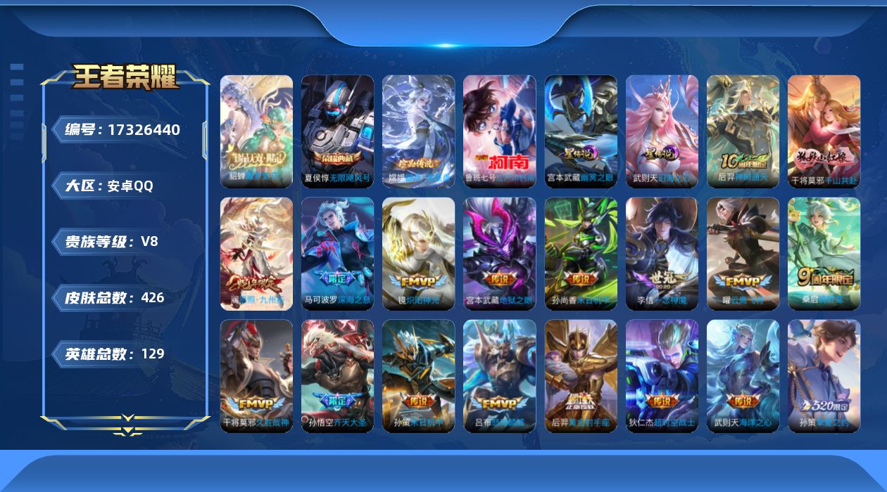 - [16301795]【店主推荐捡漏号】安卓Q-V9-至尊星耀IV段位-129英雄-465皮肤-4典藏皮肤-1典藏英雄-1珍品传说-30传说-152史诗 【英雄全皮】:阿轲全皮,达摩全皮,刘邦全皮,孙权全皮,太乙真人全皮,狂铁全皮,猪八戒全皮,鲁班大师全皮,金蝉全皮,空空儿全皮,影全皮 【荣耀典藏】:武则天英雄,武则天倪克斯神谕,小乔天鹅之梦,李白鸣剑曳影,虞姬神鉴启示录 【珍品传说】:马可波罗怪盗基德 【传说皮肤】:后羿神树通天,司空震愿照山河定,妲己愿照众生和,澜愿照九州拓,云缨幻光神枪,桑启鸣野蒿,孙策乘龙淬吴钩,赵云乘龙铭钟鼎,张飞百相守梦,干将莫邪画中仙,孙悟空齐天大圣,吕布怒海麟威,女娲补天,鲁班七号寅虎瑞焰,赵云淬星耀世,西施游龙清影,李元芳飞鸢探春,镜炽阳神光,虞姬启明星使,曜云鹰飞将,李信一念神魔,干将莫邪久胜战神,虞姬云霓雀翎,达摩黄金狮子座,花木兰冠军飞将,貂蝉仲夏夜之梦,孙尚香末日机甲,宫本武藏地狱之眼,武则天海洋之心,狄仁杰超时空战士 【限定皮肤】:白起狰,暃埋骨钱,蔡文姬夏日便利店,大乔绒语心约,虞姬夏日便利店,姜子牙天穹之誓,杨戬破阵退雄兵,狄仁杰阴阳师,虞姬凯尔特女王,廉颇寅虎御盾,赵云皇家上将,赵云百木心枪,墨子神迹守卫,墨子降魔,嬴政优雅恋人,嬴政白昼王子,鲁班七号狮舞东方,鲁班七号寅虎瑞焰,庄周蜃楼王,庄周高山流水,高渐离死亡摇滚,阿轲迷踪丽影,钟无艳超时空战士,孙膑妖精王,孙膑天狼运算者,扁鹊炼金王,扁鹊奇幻香踪,白起夜都怪侠,芈月重明,芈月幻夜卜梦,吕布猎兽之王,周瑜赤莲之焰,元歌云间偶戏,元歌无心,夏侯惇朔风刀,夏侯惇匿光决锋者,甄姬女儿国国王,甄姬游园惊梦,甄姬落雪兰心,曹操烛龙,典韦穷奇,典韦蓝屏警告,马可波罗逐梦之星,马可波罗暗影游猎,马可波罗山海玄木吟,狄仁杰魔术师,狄仁杰万华元夜,达摩星际陆战队,达摩沙漠行僧,项羽海滩派对,项羽霸王别姬,老夫子圣诞老人,老夫子醍醐杖,老夫子航海奇遇记,关羽冰锋战神,安琪拉魔法小厨娘,程咬金演武夺筹,刘邦夺宝奇兵,韩信逐梦之影,韩信傲雪梅枪,王昭君凤凰于飞,王昭君午后时光,兰陵王驯魔猎人,兰陵王金庭之子,亚瑟潮玩骑士王,孙悟空至尊宝,孙悟空大圣娶亲,孙悟空孙行者,孙悟空齐天大圣,牛魔御旌,牛魔奔雷神使,后羿辉光之辰,后羿圣弓游侠,张飞百相守梦,李元芳银河之约,李元芳云中旅人,虞姬霸王别姬,虞姬启明星使