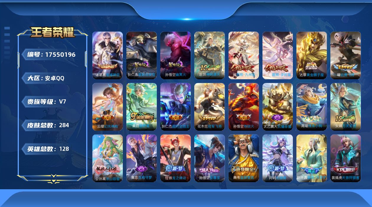 [17550196]【特价急出/详情看图】安卓Q-V7-永恒钻石I段位-128英雄-284皮肤-1典藏皮肤-2星元-10传说-63史诗