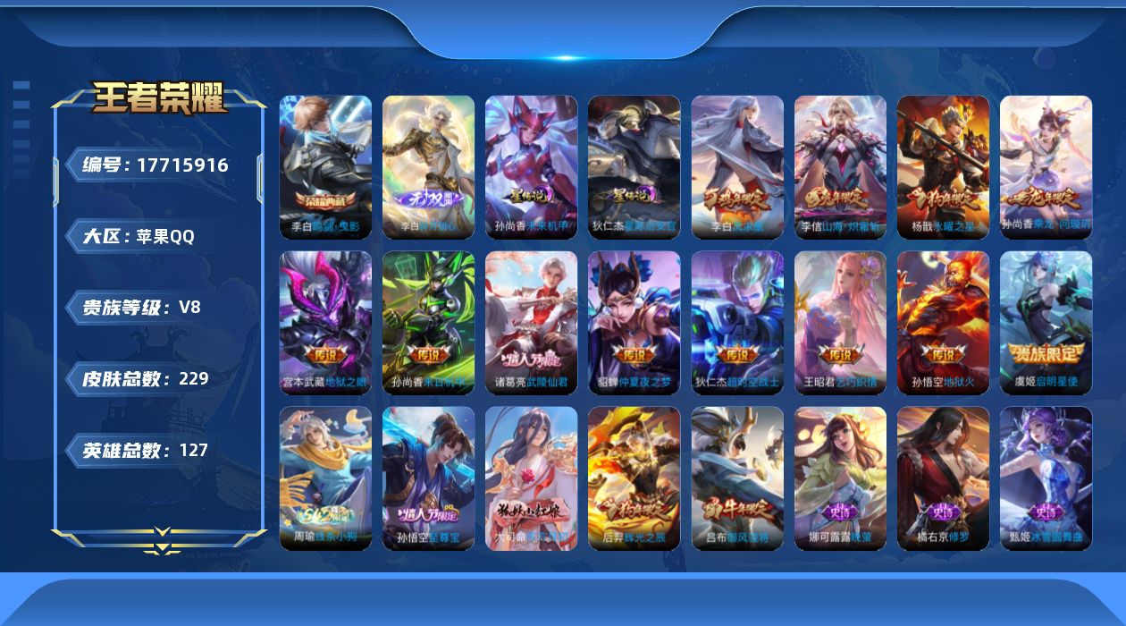 - [12082647]V10 4典藏 1无双 48传说 125英雄 437皮肤 可修改实名 优质装备:鸣剑·曳影,全息碎影(猴子典藏),弑枪猎影(韩信典藏),碎月剑心(李白无双),拾光映像(瑶典藏),黄金狮子座,黄金射手座,冠军飞将,云鹰飞将(小将军),绛天战甲(鸡嘴战神),久胜战神,炽阳神光,一念神魔,末日机甲-孙尚香(绿蚂蚱),仲夏夜之梦(大飞蛾),地狱之眼,音你心动-周瑜,李逍遥,时之恋人-刘备(电焊工),淬星耀世,超时空战士-狄仁杰,遇见胡旋,挚爱之约,无双飞将,碎云,神器·狴犴令,山海·炽霜斩(李信年限),山海·苍雷引(电光曜子),炽翼辉光(娃娃菜牛角包),燃星之曲,浮生妄,艾琳觅芳踪,涂山容容 传说皮:乘龙·铭钟鼎(赵云年限),乘龙·淬吴钩(孙策年限),落雪白狼,续相思 珍宝阁皮:妄想食味,女武神,玩趣恶龙 限定皮:愿照·千秋盛(女娲年限),鸣野蒿,凤求凰(白切鸡),凤凰于飞,太华(伽罗年限),武陵仙君(小桃花),异界灵契(白毛香),傲雪梅枪,补天,星穹之声,神威(电光马子),飞衡(韩信年限),瑞麟志(木兰年限),至美·乘鲤谣,遇见飞天,高山流水,诗剑行,齐天大圣,匿光决锋者,怒海麟威,降魔,五谷丰年,青龙志(铠年限),梁祝,御风骁将(吕布年限),烈魂,天狼绘梦者,逐梦之影,朱雀志(守约年限),孙行者,蜜橘之夏,匿光追影者,寅虎·御盾(廉颇年限),寅虎·瑞焰(虎皮蛋子),寅虎·赤拳(老虎年限),百木心枪,玉兔公主,启示之音,无尽星芒,深海之息(深海大菠萝),唐三藏,匿光启智者,神器·万象笔,山海·玄木吟(马可年限) 史诗皮:赞萌露比,鸭鸭历险记-刘禅,化蝶舞,灵蛊蚀心,星界战将,谪仙醉月,龙之律动,石田雨龙,百相守梦-周瑜,茶境仙,幻珠鲛人,怒海争锋,破空之剑,蔬乡物语(鲁班七号),百相守梦-黄忠,织梦人,遇见神鹿,紫霞仙子,苍穹之光,电玩小子(小书包),白龙吟,黄金分割率,特工魅影,千年之狐,永昼,江河有灵,鹤归松栖(赵怀真),魅语,百解令(蒙犽),高渐离燃音魔法,蒙恬荣光圣徽,冰冠公主,青蛇,偶像歌手,晚萤,电玩·爆裂旋风,暗夜猫娘,龙骑士(小龙虾),末日机甲-吕布,猫狗日记-孙策,猫狗日记-大乔,时之恋人-孙尚香,乱世虎臣,节奏热浪,修罗,女仆咖啡,摇滚巨星,水果甜心,绅士熊喵,天才门将,星夜王子,心灵骇客,时之奇旅-安琪拉,功夫厨神,德古拉伯爵,暗隐猎兽者,幽灵船