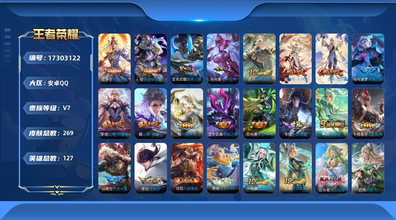 [17303122]【店主推荐捡漏号!可直接换绑】安卓Q-V7-至尊星耀III段位-127英雄-269皮肤-2典藏皮肤-14传说-81史诗-2星元