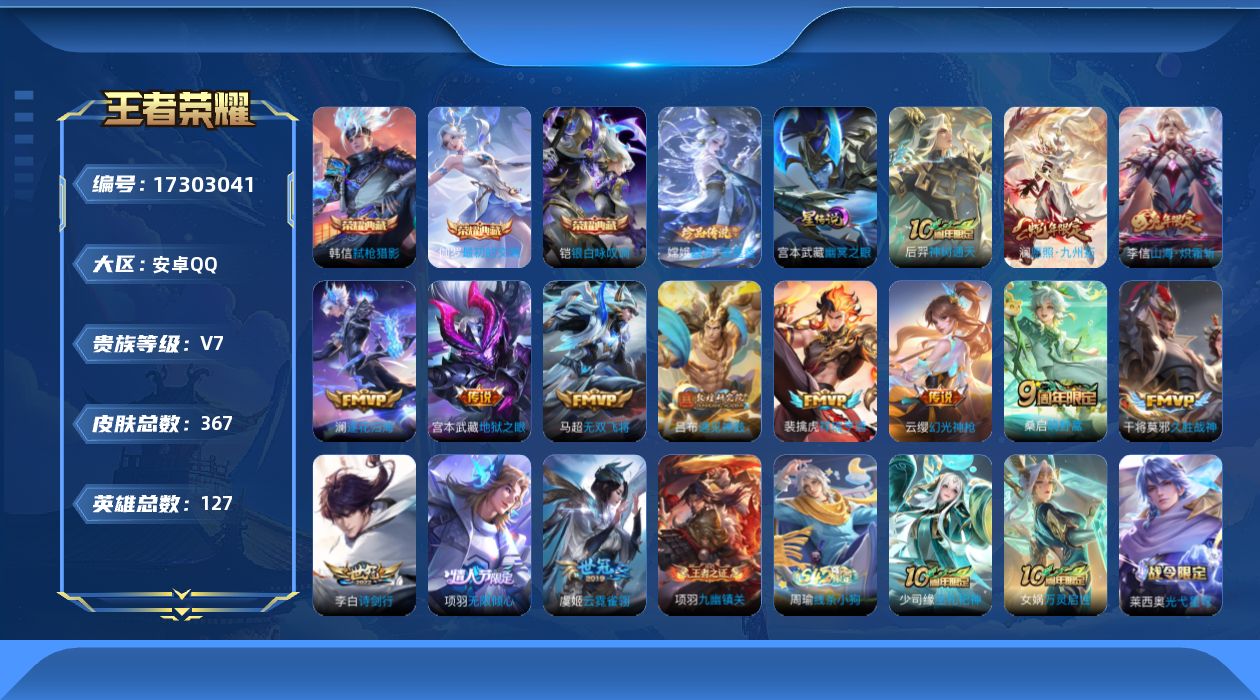 [17303041]【店主推荐捡漏号!可直接换绑】安卓Q-V7-最强王者段位-127英雄-367皮肤-3典藏皮肤-1珍品传说-14传说-92史诗-1星元 【英雄全皮】:孙权全皮,苍全皮,蒙恬全皮,戈娅全皮,影全皮 【荣耀典藏】:铠银白咏叹调,韩信弑枪猎影,伽罗最初的交响 【珍品传说】:嫦娥器灵落星盏 【传说皮肤】:后羿神树通天,澜愿照九州拓,云缨幻光神枪,裴擒虎祥瑞亨通,桑启鸣野蒿,澜逐花归海,吕布遇见神鼓,项羽无限倾心,李信山海炽霜斩,李白诗剑行,马超无双飞将,干将莫邪久胜战神,虞姬云霓雀翎,宫本武藏地狱之眼 【限定皮肤】:白起狰,虞姬夏日便利店,姜子牙天穹之誓,杨戬破阵退雄兵,李白谪仙醉月,狄仁杰阴阳师,虞姬凯尔特女王,赵云皇家上将,庄周蜃楼王,高渐离玩趣恶龙,钟无艳王者之锤,钟无艳超时空战士,孙膑妖精王,扁鹊炼金王,芈月重明,吕布遇见神鼓,元歌云间偶戏,元歌无心,夏侯惇朔风刀,甄姬落雪兰心,典韦穷奇,马可波罗暗影游猎,狄仁杰魔术师,狄仁杰万华元夜,达摩沙漠行僧,项羽海滩派对,项羽无限倾心,老夫子醍醐杖,程咬金演武夺筹,兰陵王金庭之子,孙悟空美猴王,孙悟空至尊宝,牛魔御旌,李元芳云中旅人,钟馗驱傩正仪,杨玉环遇见飞天,雅典娜黎明之约,太乙真人饕餮,鬼谷子原初探秘者,鬼谷子五谷丰年,苏烈千军破阵,百里玄策原初追逐者,弈星混沌棋,梦奇顽趣,沈梦溪大漠名商,明世隐疑决卦,裴擒虎李小龙,裴擒虎擒涛扼浪,狂铁御狮,米莱狄御霄,云中君纤云弄巧,李信山海炽霜斩,盾山御銮,上官婉儿梁祝,嫦娥拒霜思,嫦娥暖冬兔眠,西施玲珑珍味,鲁班大师探海日志,桑启海盐诗旅,暃星界游侠,戈娅驭风魔法,艾琳女武神,艾琳流音漫舞,司空震地狱燃心,阿古朵江河有灵,张良古海寻踪,蒙犽百解令,蒙恬荣光圣徽,高渐离燃音魔法,妲己灵卜魔法,鬼谷子天穹祈灯,姬小满妄想食味,沈梦溪龙舞盛年,鲁班七号蔬乡物语,李元芳蔬乡物语,刘邦剑破天穹,程咬金群星魔术团,周瑜熔金海岸 【年限皮肤】:孙悟空美猴王,李信山海炽霜斩,澜愿照九州拓 【赛季限定】:庄周蜃楼王,孙膑妖精王,扁鹊炼金王,虞姬凯尔特女王,白起狰,太乙真人饕餮,芈月重明,典韦穷奇,狂铁御狮,米莱狄御霄,牛魔御旌,盾山御銮,夏侯惇朔风刀,弈星混沌棋,明世隐疑决卦,老夫子醍醐杖,鬼谷子原初探秘者,狄仁杰万华元夜,程咬金演武夺筹,钟馗驱傩正仪,苏烈千军破阵,达摩沙漠行僧,兰陵王金庭之子