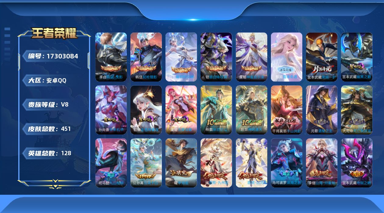 [17303084]【特价出售/店主推荐】3银标、打野42段、发育路31段,安卓Q-V8-最强王者段位-128英雄-451皮肤-5典藏皮肤-1无双-1珍品传说-5星传说-30传说-132史诗 【英雄全皮】:刘禅全皮,元歌全皮,达摩全皮,司马懿全皮,孙权全皮,太乙真人全皮,狂铁全皮,大司命全皮,鲁班大师全皮,司空震全皮,云缨全皮,赵怀真全皮,戈娅全皮,空空儿全皮,影全皮,海诺全皮,少司缘全皮 【荣耀典藏】:李白鸣剑曳影,铠银白咏叹调,韩信弑枪猎影,虞姬神鉴启示录,伽罗最初的交响 【无双皮肤】:甄姬雪境奇遇 【珍品传说】:宫本武藏黑崎一护 【传说皮肤】:杨戬纵目迁山,后羿神树通天,干将莫邪千山共赴,元歌诡秘之主,大司命死亡执政官,司马懿九山相柳,公孙离云诺千山,司空震愿照山河定,澜愿照九州拓,云缨幻光神枪,裴擒虎祥瑞亨通,桑启鸣野蒿,云缨鹤归松栖,诸葛亮鹤羽星尊,虞姬无限倾心,孙悟空齐天大圣,李信山海炽霜斩,吕布怒海麟威,马可波罗深海之息,马超无双飞将,孙策挚爱之约,赵云淬星耀世,西施游龙清影,曜李逍遥 ,虞姬启明星使,刘备时之恋人,达摩黄金狮子座,貂蝉仲夏夜之梦,孙尚香末日机甲,宫本武藏地狱之眼 【限定皮肤】:白起狰,大乔绒语心约,虞姬夏日便利店,姜子牙天穹之誓,李白谪仙醉月,狄仁杰阴阳师,廉颇寅虎御盾,赵云皇家上将,墨子神迹守卫,孙尚香蔷薇恋人,庄周高山流水,高渐离死亡摇滚,钟无艳超时空战士,扁鹊奇幻香踪,白起夜都怪侠,芈月重明,芈月幻夜卜梦,元歌云间偶戏,元歌无心,夏侯惇朔风刀,夏侯惇匿光决锋者,甄姬游园惊梦,甄姬落雪兰心,曹操烛龙,典韦穷奇,马可波罗暗影游猎,马可波罗深海之息,马可波罗山海玄木吟,狄仁杰魔术师,狄仁杰万华元夜,达摩星际陆战队,达摩沙漠行僧,项羽海滩派对,老夫子醍醐杖,老夫子航海奇遇记,关羽冰锋战神,程咬金演武夺筹,王昭君午后时光,兰陵王驯魔猎人,兰陵王金庭之子,孙悟空孙行者,孙悟空齐天大圣,后羿圣弓游侠,李元芳云中旅人,虞姬启明星使,虞姬无限倾心,钟馗驱傩正仪,杨戬潮玩骑兵,干将莫邪真爱魔法,雅典娜黎明之约,太乙真人饕餮,太乙真人华丽摇滚,鬼谷子原初探秘者,鬼谷子五谷丰年,诸葛亮鹤羽星尊,黄忠火炮绅士,苏烈千军破阵,百里玄策原初追逐者,百里守约朱雀志,弈星混沌棋,梦奇顽趣,沈梦溪大漠名商,明世隐疑决卦,明世隐吟游魔法,裴擒虎李小龙,裴擒虎擒涛扼浪,狂铁御狮,狂铁电