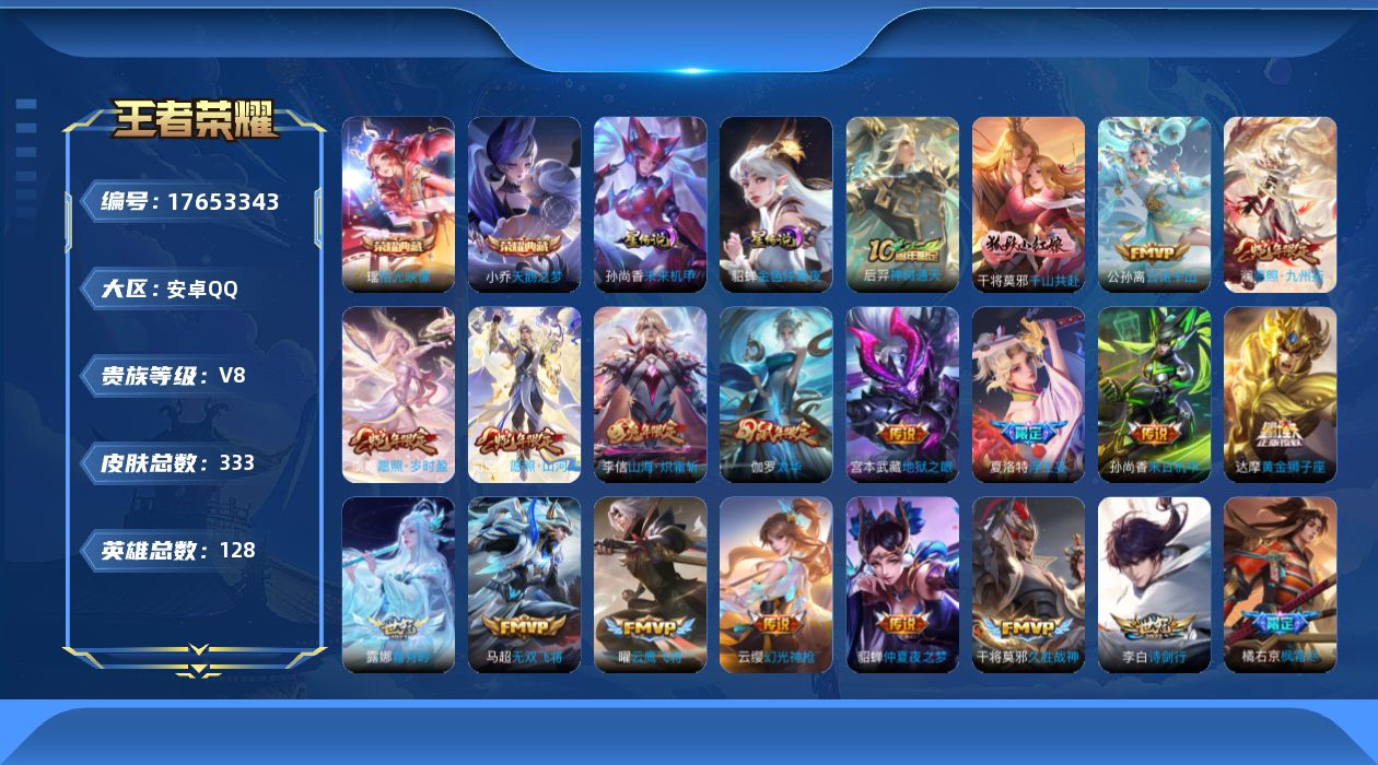 [17653343]可二次【特价出售/店主推荐/3市标/3417星币】:安卓Q-V8-最强王者段位-128英雄-333皮肤-2典藏皮肤-2星元-28传说-93史诗