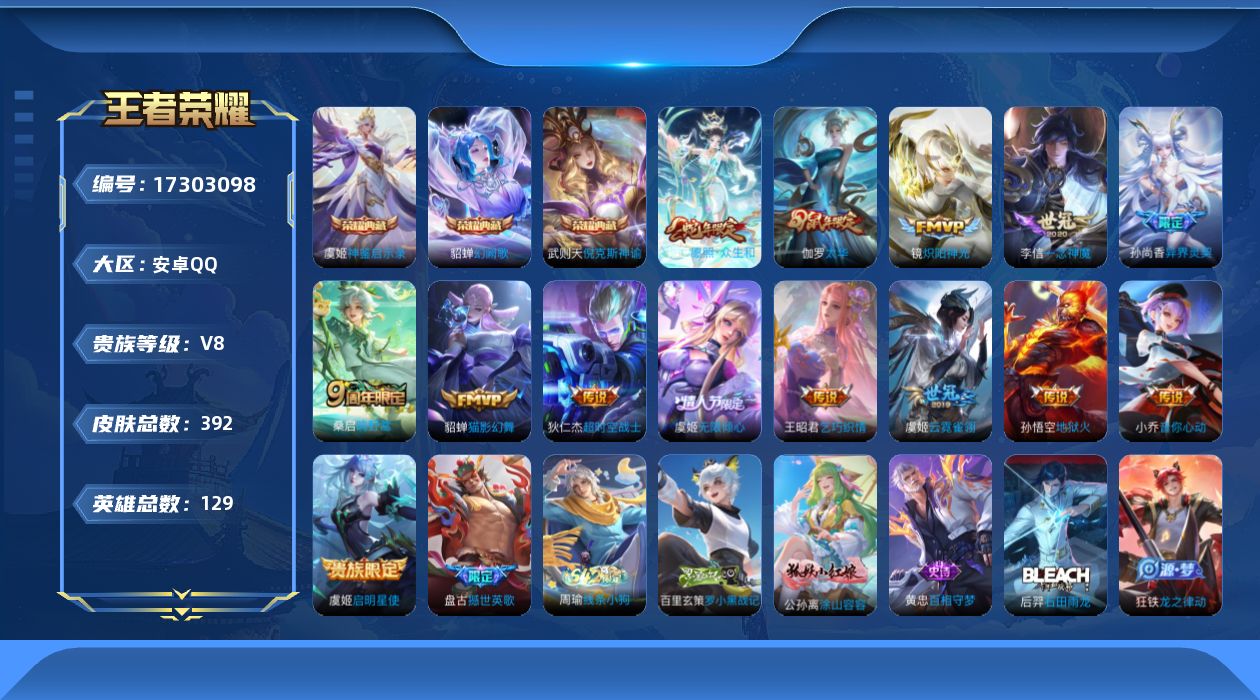 [17303098]安卓Q-V8-永恒钻石II段位-129英雄-392皮肤-3典藏皮肤-1典藏英雄-14传说-112史诗【英雄全皮】:刘禅全皮,扁鹊全皮,孙权全皮,鬼谷子全皮,戈娅全皮,空空儿全皮,影全皮【荣耀典藏】:武则天英雄,武则天倪克斯神谕,貂蝉幻阙歌,虞姬神鉴启示录【传说皮肤】:妲己愿照众生和,桑启鸣野蒿,虞姬无限倾心,孙尚香异界灵契,王昭君乞巧织情,小乔音你心动,镜炽阳神光,虞姬启明星使,李信一念神魔,伽罗太华,貂蝉猫影幻舞,虞姬云霓雀翎,孙悟空地狱火,狄仁杰超时空战士【限定皮肤】:白起狰,姜子牙天穹之誓,狄仁杰阴阳师,虞姬凯尔特女王,赵云皇家上将,墨子神迹守卫,嬴政白昼王子,孙尚香蔷薇恋人,孙尚香异界灵契,鲁班七号狮舞东方,庄周蜃楼王,庄周高山流水,阿轲迷踪丽影,钟无艳超时空战士,孙膑妖精王,扁鹊炼金王,扁鹊奇幻香踪,芈月重明,芈月幻夜卜梦,吕布猎兽之王,吕布御风骁将,周瑜赤莲之焰,元歌云间偶戏,元歌无心,夏侯惇朔风刀,甄姬女儿国国王,甄姬落雪兰心,曹操烛龙,典韦穷奇,典韦蓝屏警告,马可波罗暗影游猎,狄仁杰魔术师,狄仁杰万华元夜,达摩星际陆战队,达摩沙漠行僧,项羽海滩派对,老夫子醍醐杖,老夫子航海奇遇记,程咬金演武夺筹,刘邦夺宝奇兵,韩信傲雪梅枪,兰陵王驯魔猎人,兰陵王金庭之子,花木兰青春决赛季,亚瑟狮心王,亚瑟潮玩骑士王,牛魔御旌,后羿圣弓游侠,李元芳银河之约,李元芳云中旅人,虞姬启明星使,虞姬无限倾心,钟馗神迹守卫,钟馗驱傩正仪,杨玉环遇见飞天,杨戬潮玩骑兵,女娲朔望之晖,干将莫邪胡桃夹子,干将莫邪真爱魔法,雅典娜单词大作战,雅典娜黎明之约,蔡文姬繁星吟游,太乙真人饕餮,鬼谷子原初探秘者,鬼谷子五谷丰年,黄忠火炮绅士,苏烈千军破阵,百里玄策原初追逐者,百里守约朱雀志,弈星混沌棋,梦奇顽趣,沈梦溪星空之诺,沈梦溪大漠名商,明世隐疑决卦,裴擒虎李小龙,裴擒虎擒涛扼浪,狂铁御狮,米莱狄御霄,米莱狄胡桃异想国,云中君纤云弄巧,伽罗太华,伽罗天狼溯光者,盾山御銮,猪八戒西部大镖客,上官婉儿梁祝,嫦娥拒霜思,嫦娥暖冬兔眠,西施玲珑珍味,蒙犽狂想玩偶喵,鲁班大师探海日志,桑启海盐诗旅,暃星界游侠,戈娅驭风魔法,艾琳女武神,艾琳流音漫舞,司空震地狱燃心,阿古朵江河有灵,张良古海寻踪,蒙犽百解令,蒙恬荣光圣徽,高渐离燃音魔法,妲己灵卜魔法,鬼谷子天穹祈灯,伽罗琥珀纪元,沈梦溪龙舞盛年,