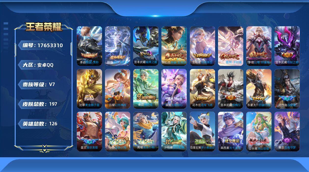 [17653310]可二次【特价出售/店主推荐】:安卓Q-V7-最强王者段位-126英雄-197皮肤-1典藏皮肤-1珍品传说-1星元-12传说-59史诗