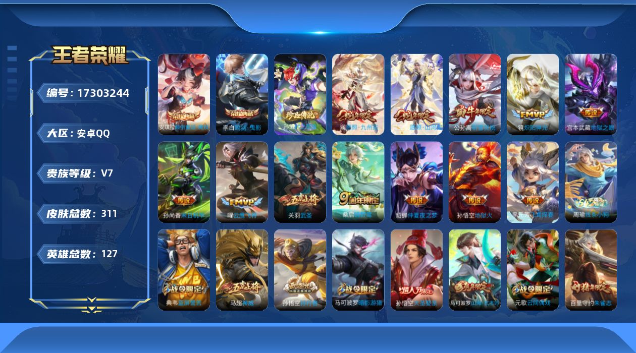 [17303244]安卓Q-V7-最强王者段位-127英雄-311皮肤-2典藏皮肤-1珍品传说-12传说-88史诗【英雄全皮】:猪八戒全皮,影全皮【荣耀典藏】:李白鸣剑曳影,安琪拉颠倒童话魔镜【珍品传说】:孙策时之奇旅【传说皮肤】:司空震愿照山河定,澜愿照九州拓,桑启鸣野蒿,李元芳飞鸢探春,公孙离祈雪灵祝,镜炽阳神光,关羽武圣,曜云鹰飞将,貂蝉仲夏夜之梦,孙尚香末日机甲,宫本武藏地狱之眼,孙悟空地狱火【限定皮肤】:白起狰,蒙犽顽岩魄,蔡文姬夏日便利店,虞姬夏日便利店,姜子牙天穹之誓,狄仁杰阴阳师,赵云皇家上将,墨子神迹守卫,鲁班七号狮舞东方,庄周高山流水,高渐离死亡摇滚,高渐离玩趣恶龙,阿轲迷踪丽影,钟无艳王者之锤,芈月重明,芈月幻夜卜梦,吕布猎兽之王,元歌云间偶戏,夏侯惇朔风刀,曹操烛龙,典韦穷奇,典韦蓝屏警告,马可波罗暗影游猎,马可波罗山海玄木吟,狄仁杰魔术师,狄仁杰万华元夜,达摩星际陆战队,达摩沙漠行僧,项羽海滩派对,老夫子醍醐杖,老夫子航海奇遇记,关羽武圣,程咬金演武夺筹,刘邦夺宝奇兵,韩信飞衡,兰陵王金庭之子,亚瑟潮玩骑士王,孙悟空大圣娶亲,孙悟空孙行者,牛魔御旌,后羿圣弓游侠,李元芳银河之约,李元芳云中旅人,钟馗神迹守卫,钟馗驱傩正仪,杨玉环遇见飞天,女娲朔望之晖,干将莫邪胡桃夹子,干将莫邪真爱魔法,雅典娜单词大作战,雅典娜黎明之约,蔡文姬繁星吟游,太乙真人华丽摇滚,鬼谷子原初探秘者,鬼谷子五谷丰年,黄忠火炮绅士,苏烈千军破阵,百里玄策原初追逐者,百里守约朱雀志,弈星混沌棋,梦奇顽趣,公孙离祈雪灵祝,沈梦溪星空之诺,沈梦溪大漠名商,明世隐疑决卦,裴擒虎李小龙,裴擒虎擒涛扼浪,狂铁御狮,米莱狄御霄,云中君纤云弄巧,盾山御銮,猪八戒西部大镖客,猪八戒猪悟能,上官婉儿梁祝,嫦娥暖冬兔眠,蒙犽狂想玩偶喵,鲁班大师探海日志,镜匿光追影者,桑启海盐诗旅,暃星界游侠,张良古海寻踪,蒙恬荣光圣徽,鬼谷子天穹祈灯,沈梦溪龙舞盛年,鲁班七号蔬乡物语,李元芳蔬乡物语,刘邦剑破天穹,程咬金群星魔术团,镜青焰无极,项羽苍威无极,周瑜熔金海岸