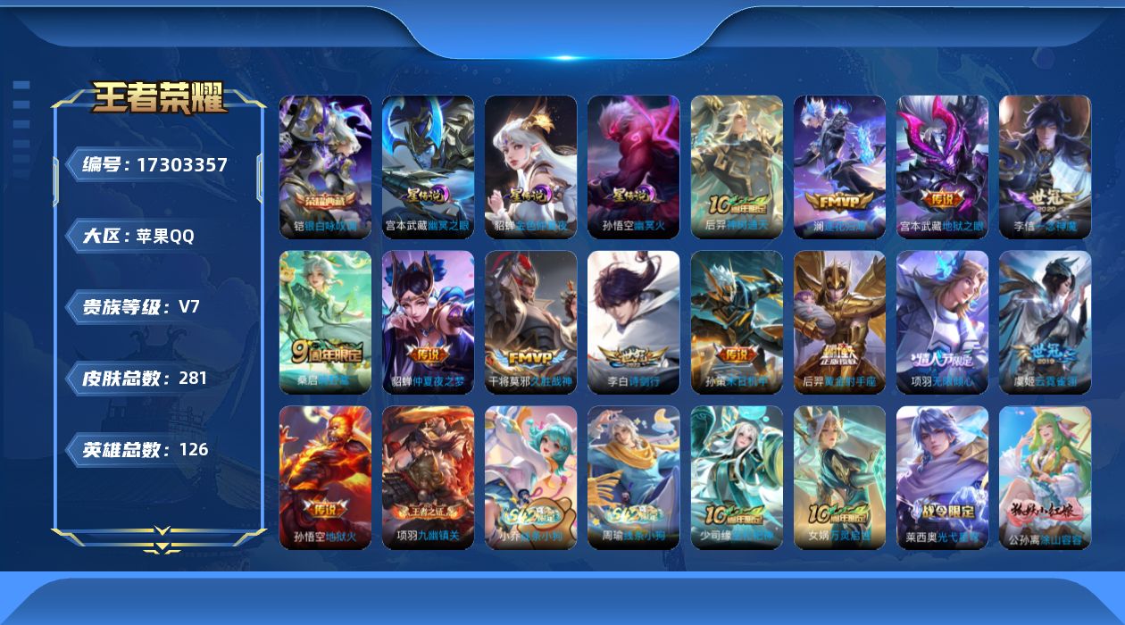 [17303357]【特价出售/店主推荐】苹果Q-V7-最强王者段位-126英雄-281皮肤-1典藏皮肤-13传说-77史诗-3星元