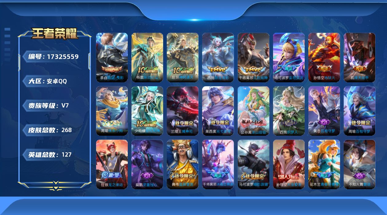 [17325559]可二次【特价出售/店主推荐 中路33段 1市标】安卓Q-V7-至尊星耀III段位-127英雄-268皮肤-1典藏皮肤-7传说-72史诗