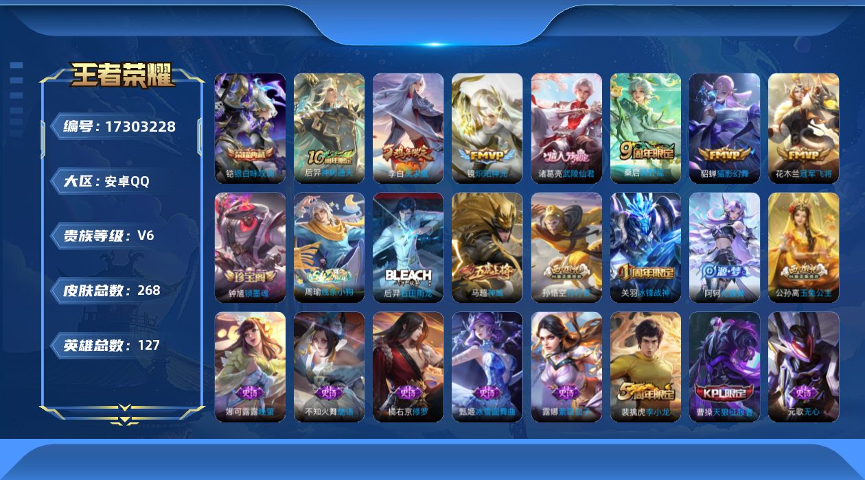 [17303228]【特价出售/店主推荐】金标诸葛亮、9市标、打野37段、中路37段、对抗路33段 安卓Q-V6-荣耀黄金I段位-127英雄-268皮肤-1典藏皮肤-7传说-65史诗 【英雄全皮】:影全皮 【荣耀典藏】:铠银白咏叹调 【传说皮肤】:后羿神树通天,桑启鸣野蒿,镜炽阳神光,貂蝉猫影幻舞,花木兰冠军飞将,诸葛亮武陵仙君,李白凤求凰 【限定皮肤】:白起狰,狄仁杰阴阳师,虞姬凯尔特女王,赵云皇家上将,嬴政优雅恋人,孙尚香蔷薇恋人,庄周蜃楼王,庄周高山流水,孙膑妖精王,芈月重明,芈月幻夜卜梦,元歌无心,夏侯惇朔风刀,甄姬游园惊梦,曹操烛龙,曹操天狼征服者,典韦穷奇,狄仁杰魔术师,狄仁杰万华元夜,达摩沙漠行僧,项羽海滩派对,老夫子醍醐杖,关羽冰锋战神,安琪拉魔法小厨娘,程咬金演武夺筹,兰陵王金庭之子,孙悟空孙行者,牛魔御旌,后羿圣弓游侠,李元芳云中旅人,钟馗驱傩正仪,杨玉环遇见飞天,干将莫邪真爱魔法,雅典娜黎明之约,蔡文姬繁星吟游,太乙真人饕餮,鬼谷子原初探秘者,鬼谷子五谷丰年,诸葛亮武陵仙君,黄忠火炮绅士,苏烈千军破阵,百里玄策原初追逐者,弈星混沌棋,梦奇顽趣,梦奇天降福星,公孙离玉兔公主,沈梦溪大漠名商,明世隐疑决卦,裴擒虎李小龙,裴擒虎擒涛扼浪,狂铁御狮,米莱狄御霄,云中君纤云弄巧,盾山御銮,上官婉儿梁祝,嫦娥拒霜思,鲁班大师探海日志,桑启海盐诗旅,阿古朵江河有灵,张良古海寻踪,蒙犽百解令,蒙恬荣光圣徽,鬼谷子天穹祈灯 【年限皮肤】:李白凤求凰 【赛季限定】:庄周蜃楼王,孙膑妖精王,虞姬凯尔特女王,白起狰,太乙真人饕餮,曹操烛龙,芈月重明,典韦穷奇,狂铁御狮,米莱狄御霄,牛魔御旌,盾山御銮,夏侯惇朔风刀,弈星混沌棋,明世隐疑决卦,老夫子醍醐杖,鬼谷子原初探秘者,狄仁杰万华元夜,程咬金演武夺筹,钟馗驱傩正仪,苏烈千军破阵,达摩沙漠行僧,兰陵王金庭之子,沈梦溪大漠名商,李元芳云中旅人,桑启海盐诗旅,裴擒虎擒涛扼浪,鲁班大师探海日志,张良古海寻踪,鬼谷子天穹祈灯,东皇太一噬灭天穹,太乙真人谧流熔炉,百里玄策原初追逐者,雅典娜黎明之约,梦奇顽趣,蒙恬荣光圣徽 【战令限定】:干将莫邪真爱魔法,后羿圣弓游侠,黄忠火炮绅士,芈月幻夜卜梦,周瑜线条小狗 【史诗皮肤】:露娜紫霞仙子,赵云皇家上将,貂蝉圣诞恋歌,甄姬冰雪圆舞曲,王昭君偶像歌手,狄仁杰魔术师,宫本武藏鬼剑武藏,孙尚香蔷薇恋人,孙尚